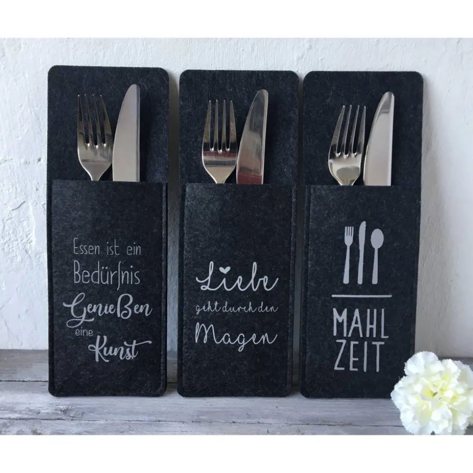 Die hier angebotenen Bestecktaschen sind 25 x 9 cm groß, aus abwaschbarem anthrazitfarbenem Filz und mit verschiedenen Sprüchen beplottet: