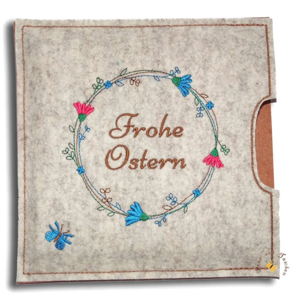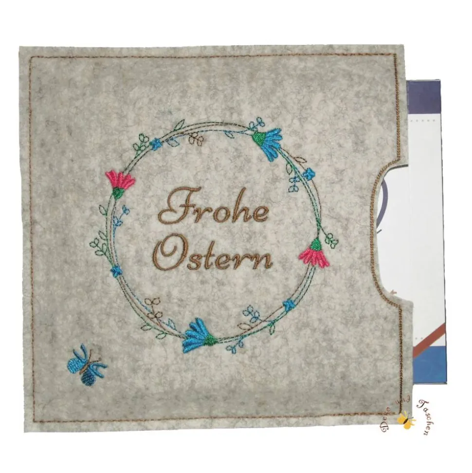 Die Hülle aus naturfarbenem Wollfilz, Rückseite aus recyceltem Leder, ist ca. 18 cm x 18 cm groß und wird mit einem Blumenkranz in kräftigen Farben bestickt. Verschiedene Texte zur Auswahl, gerne auch eigene. Passend für jede handelsübliche quadratische 200 g Schokoladentafel, wie z. B. Merci.