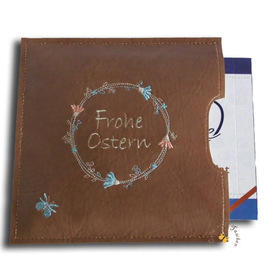 Die Hülle aus braunem Kunstleder ist ca. 18 cm x 18 cm groß und wird mit einem pastellfarbenen Blumenkranz bestickt. Verschiedene Texte zur Auswahl, gerne auch eigene. Passend für jede handelsübliche quadratische 200 g Schokoladentafel, wie z. B. Merci.