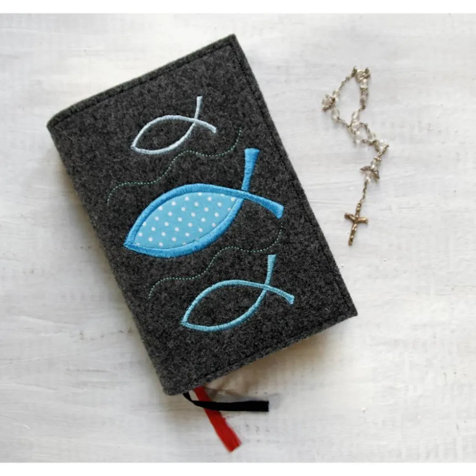 Die Vorderseite zeigt drei Fische in verschiedenen Blautönen und angedeuteten Wellen. Am Buchrücken steht in pastelltürkis „Gotteslob“.