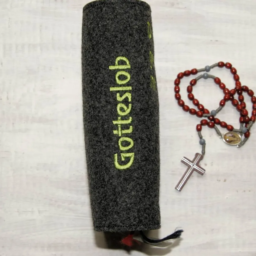 Im Gegensatz zu anderen Produkten verwende ich nicht einfach nur Folie, sondern besticke die Gotteslobhülle mit hochwertigem Stickgarn. Dadurch ist sie nicht nur schön farbenfroh, sondern auch sehr robust und langlebig.