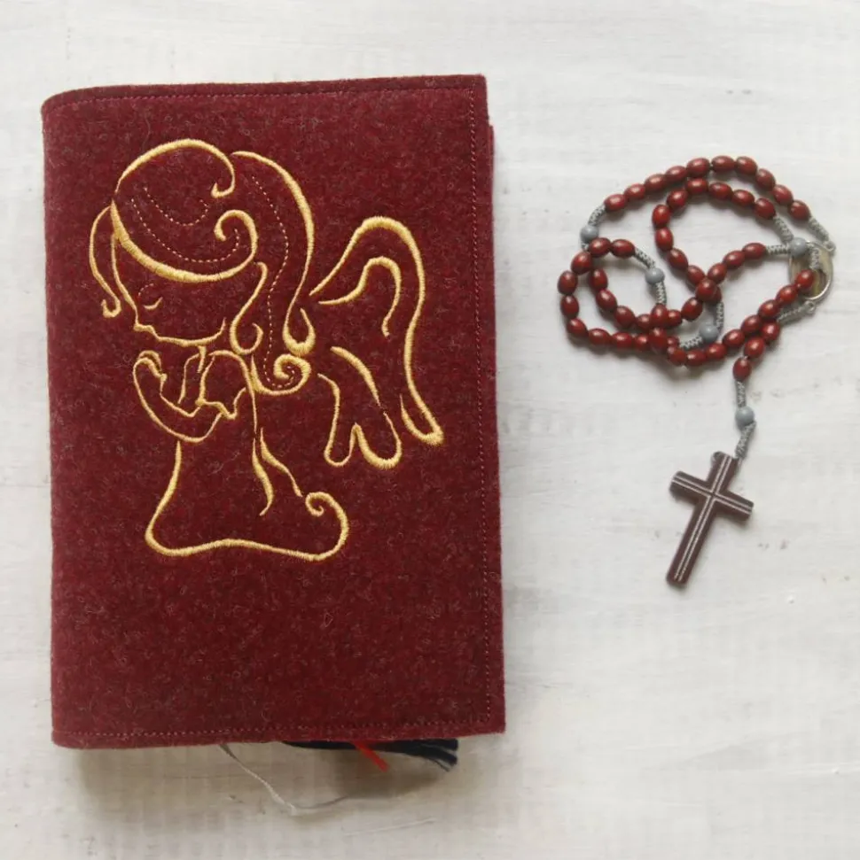 Es handelt sich um eine weinrote Filzhülle, die außen aus ca. 3 mm dickem und innen aus ca. 1,5 mm dickem hochwertigen Wollfilz besteht, damit sich das Buch besser schließen lässt, siehe Beispielfoto „Stärke“.