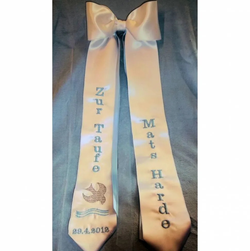 Die Schleife in der Abbildung ist 5 cm breit und aus Satinband, das nach Ihren Angaben bestickt wird. Verziert wird die Schleife zusätzlich mit farblich passenden Zierbändern.