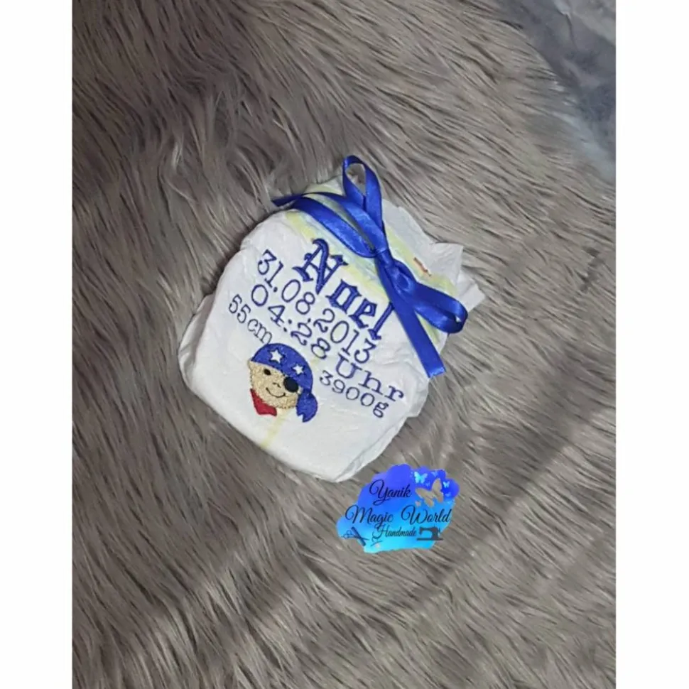 Die gewünschten und angegebenen Daten werden auf eine Newborn Windel aufgestickt.