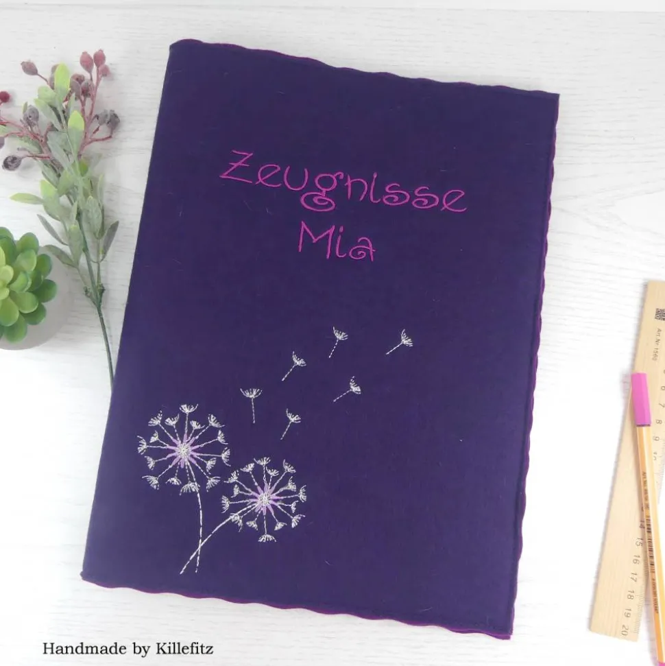 Entdecke die individuell bestickte Zeugnismappe aus lila Filz mit Pusteblume – das perfekte Geschenk zur Einschulung für Mädchen.