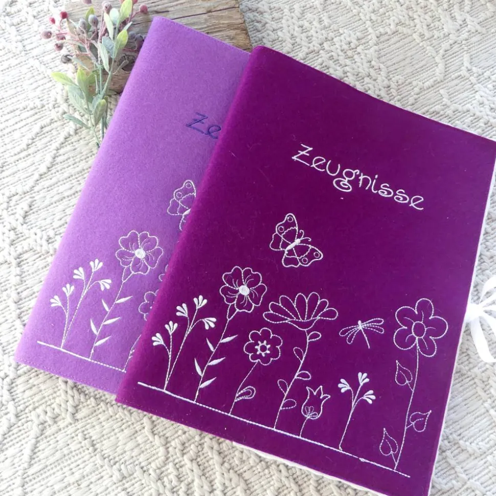 Jede Mappe ist ein Unikat, liebevoll nach deinen Wünschen bestickt und gefertigt. Die aufwendige Stickerei zeigt eine bunte Blumenwiese mit filigranen Blüten und Schmetterlingen.