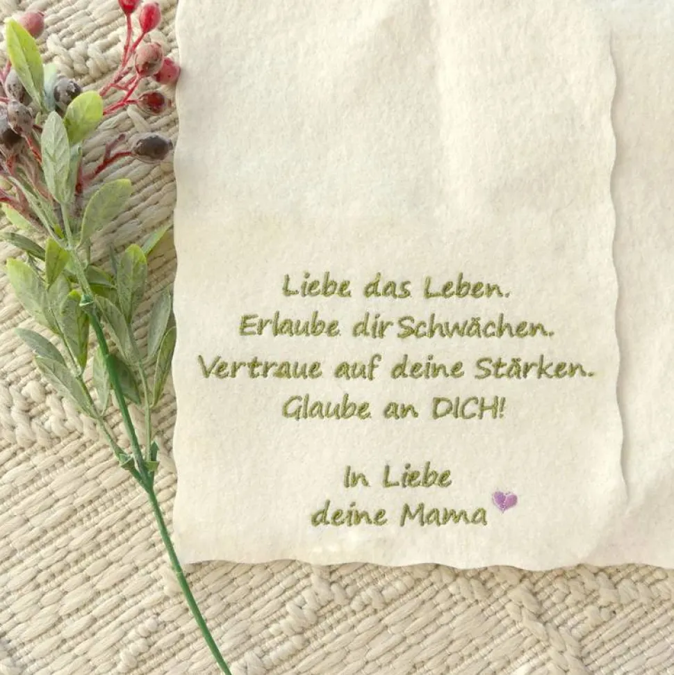 Die Mappe wird mit dem Namen des Kindes bestickt – ein ganz persönliches Geschenk, das lange an die Einschulung erinnert. Auf Wunsch ist es sogar möglich, innen einen individuellen Text, eine Widmung oder das Datum der Schuleinführung einsticken zu lassen. So wird jede Zeugnismappe zum einzigartigen Begleiter durch die gesamte Schulzeit.