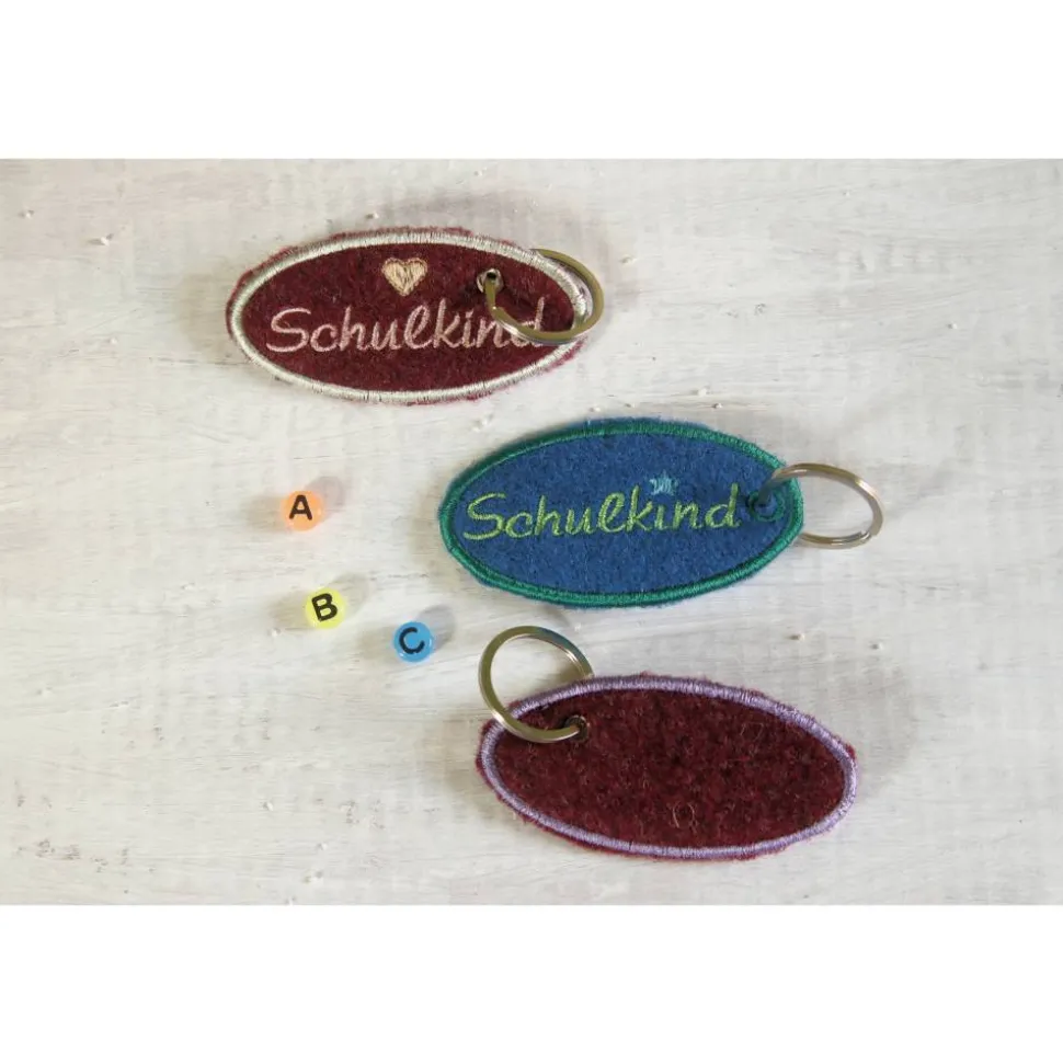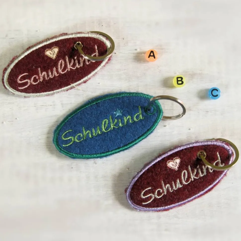 Auf der Vorderseite steht „Schulkind“, zusätzlich wird entweder ein Herz gestickt oder ein Stern.