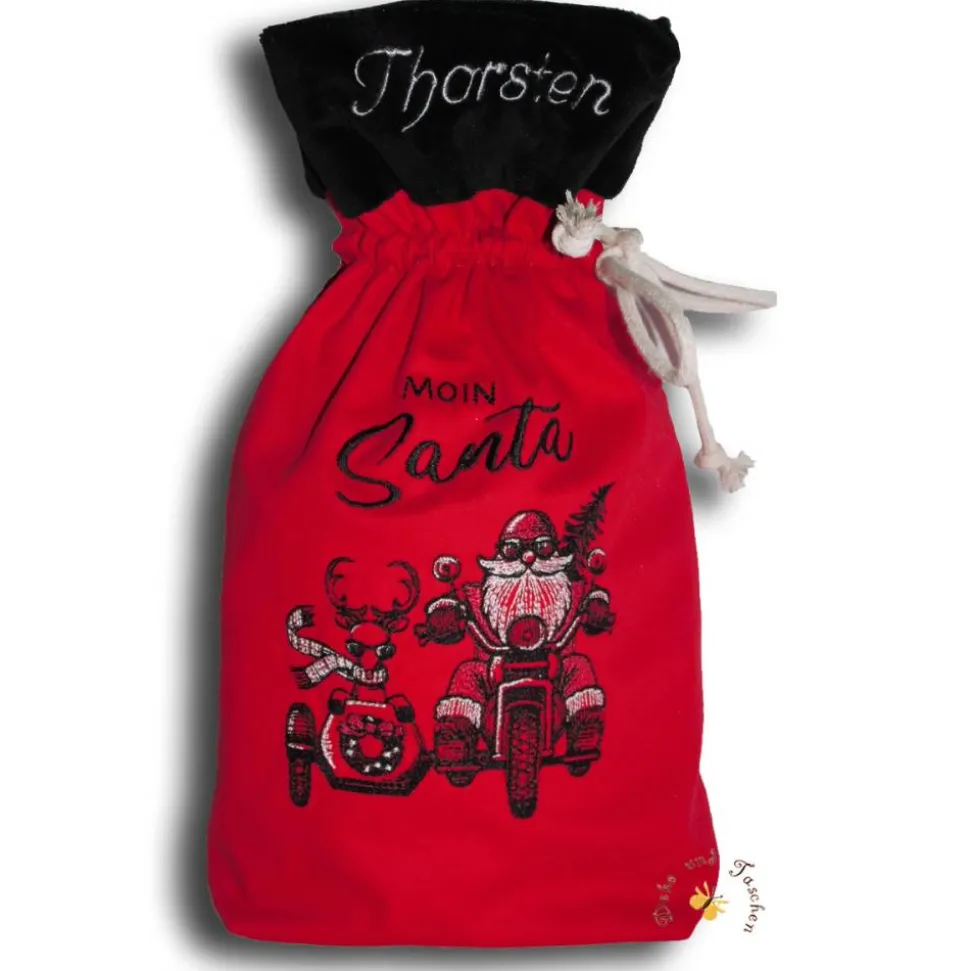 Verschiedene Stickmotive stehen zur Auswahl, siehe Foto. Die Motive werden mit dem Schriftzug „Merry Christmas“ oder „MOIN Santa“ kombiniert. Wünschen Sie einen anderen Text, geben Sie diesen bitte an.