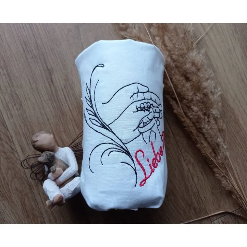 Den Baumwollstoff besticke ich mit meiner Stickmaschine nach individuellen Vorgaben. Gerne kann auch die Stickgarnfarbe gemäß beigefügter Farbkarte angepasst werden.