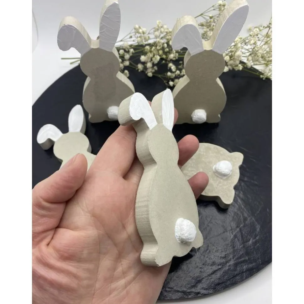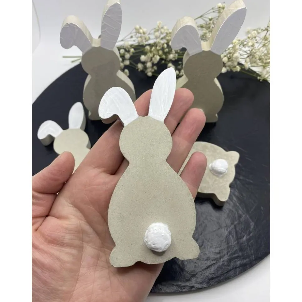 Hübscher Hase aus Beton mit weißen Ohren und Schwänzchen.