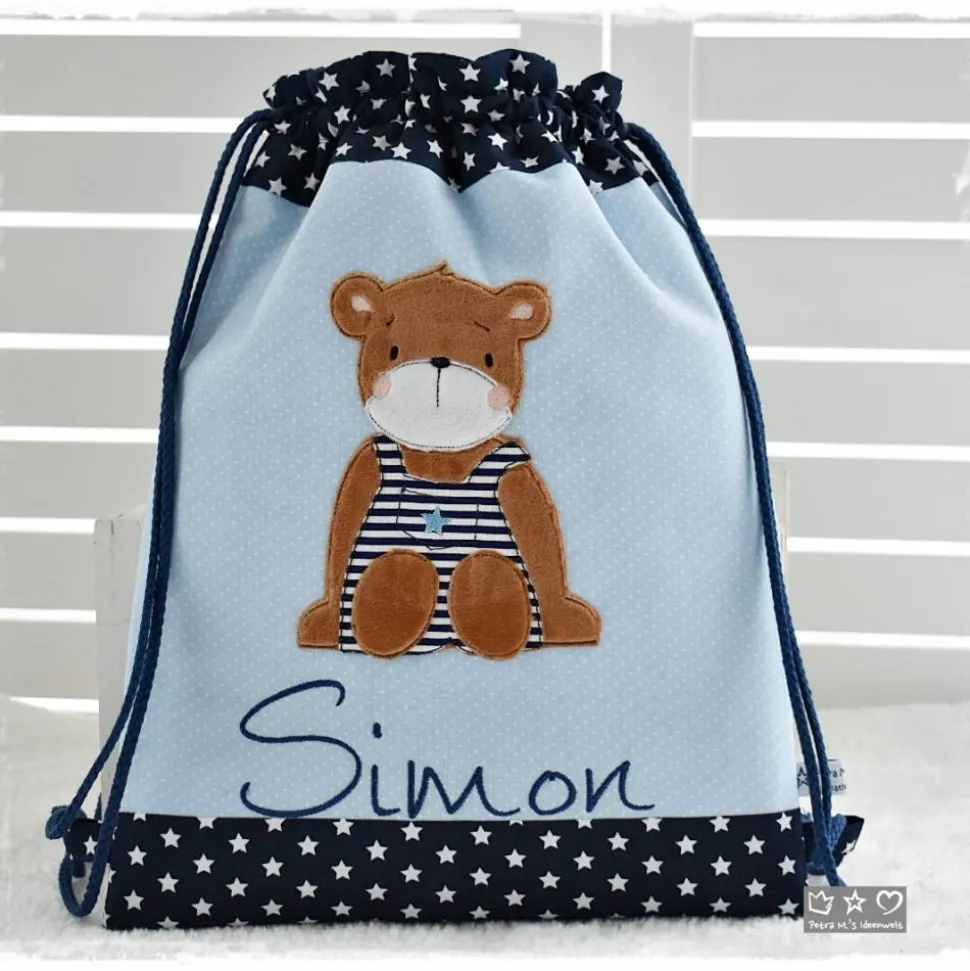 *Liebevoll genähter Rucksack-/Beutel in verschiedenen Größen aus hochwertigen Stoffen unterlegt mit Volumenvlies für mehr Stabilität. Auf der Vorderseite befindet sich eine Doodlestickerei ‚Bär‘ und auf