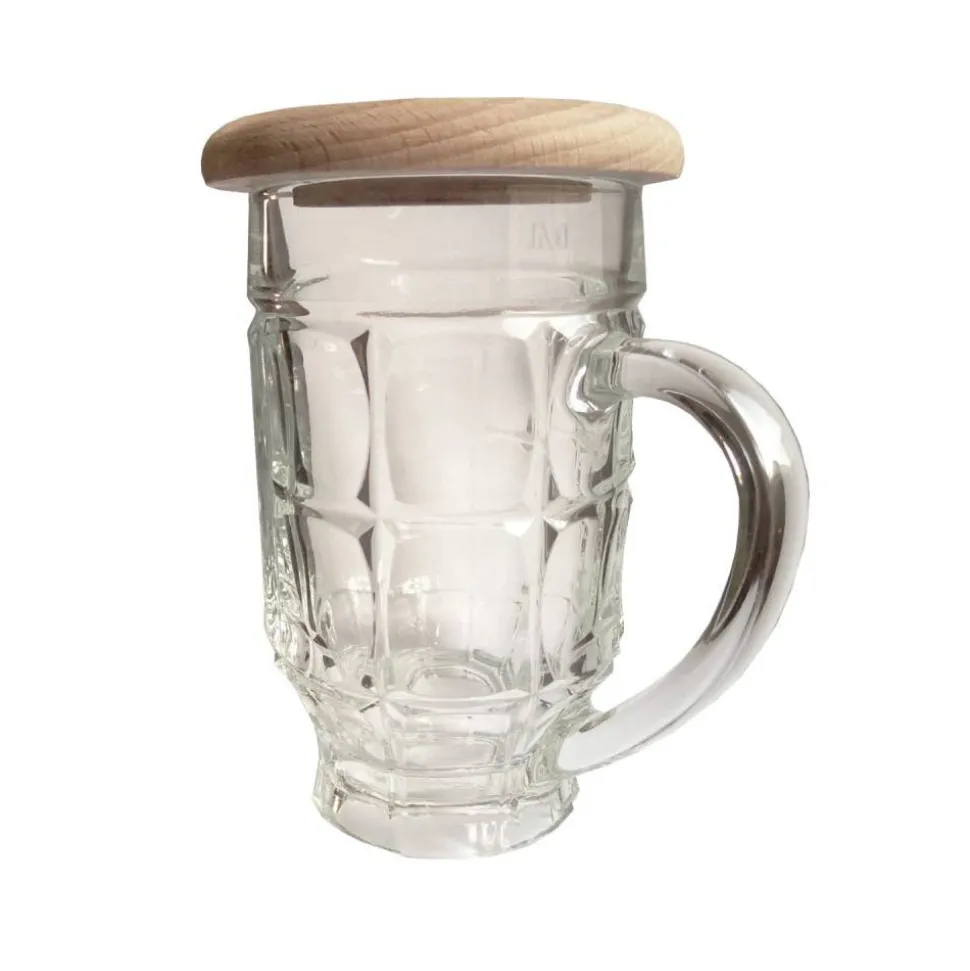 Hinweis: Die einzigartige Holzmaserung und Farbgebung des Buchenholzes ist bei jedem Bierglasdeckel unterschiedlich – die Abbildungen sind also ähnlich. Der Bierkrug gehört nicht zum Angebot.