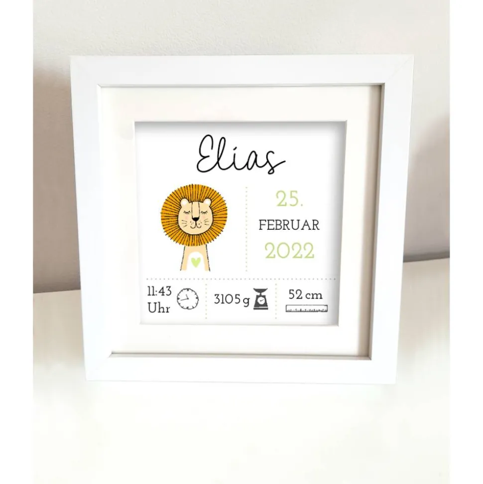 Teilt mir bitte beim Kauf die Daten wie Name, Datum, Uhrzeit, Gewicht, Größe und die Farbe blau oder grün mit. Je nach Namen, kann die Anordnung der Motive etwas vom Musterbild abweichen. Der Bilderrahmen in der Farbe weiß gehört natürlich dazu.