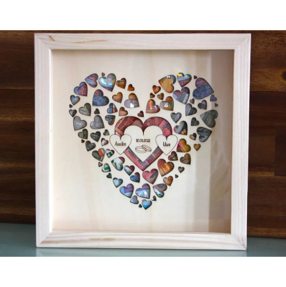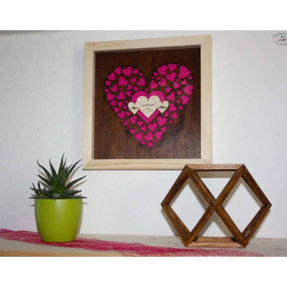 Das Inlay wurde aus Pappelholz gefertigt und wird mit den Namen des Brautpaares und des Hochzeitsdatums graviert.