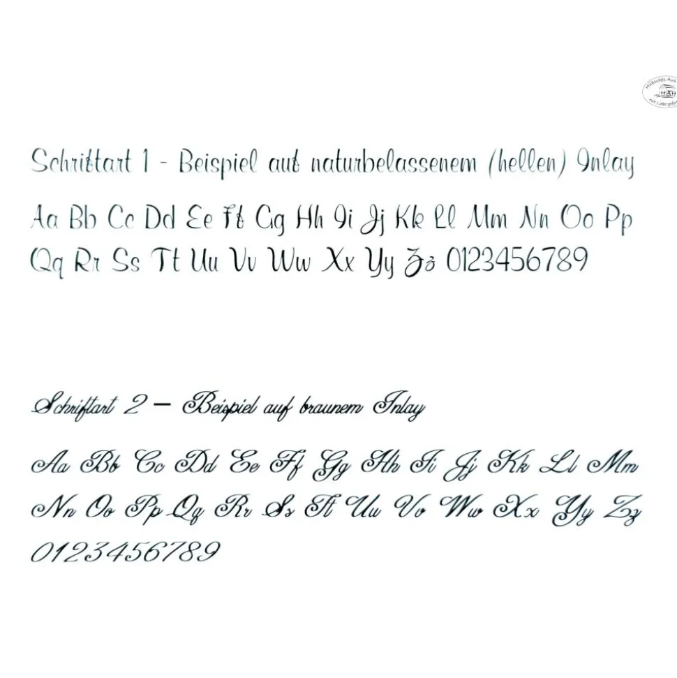 | Style | Inlay braun – Schrift 1, Inlay braun – Schrift 2, Inlay natur – Schrift 1, Inlay natur – Schrift 2 |