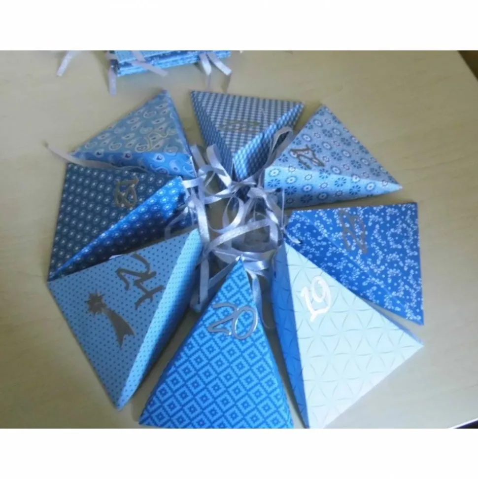 Dieser Adventskalender besteht aus 24 edlen Dreieckschachteln aus hochwertigem Bastelkarton. Jede Schachtel ist bereits geschnitten, gefalzt und mit dekorativen Zahlen beklebt. Du erhältst acht verschiedene Muster – von jedem Design genau drei Schachteln.