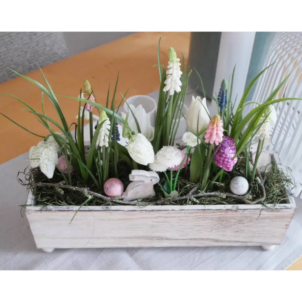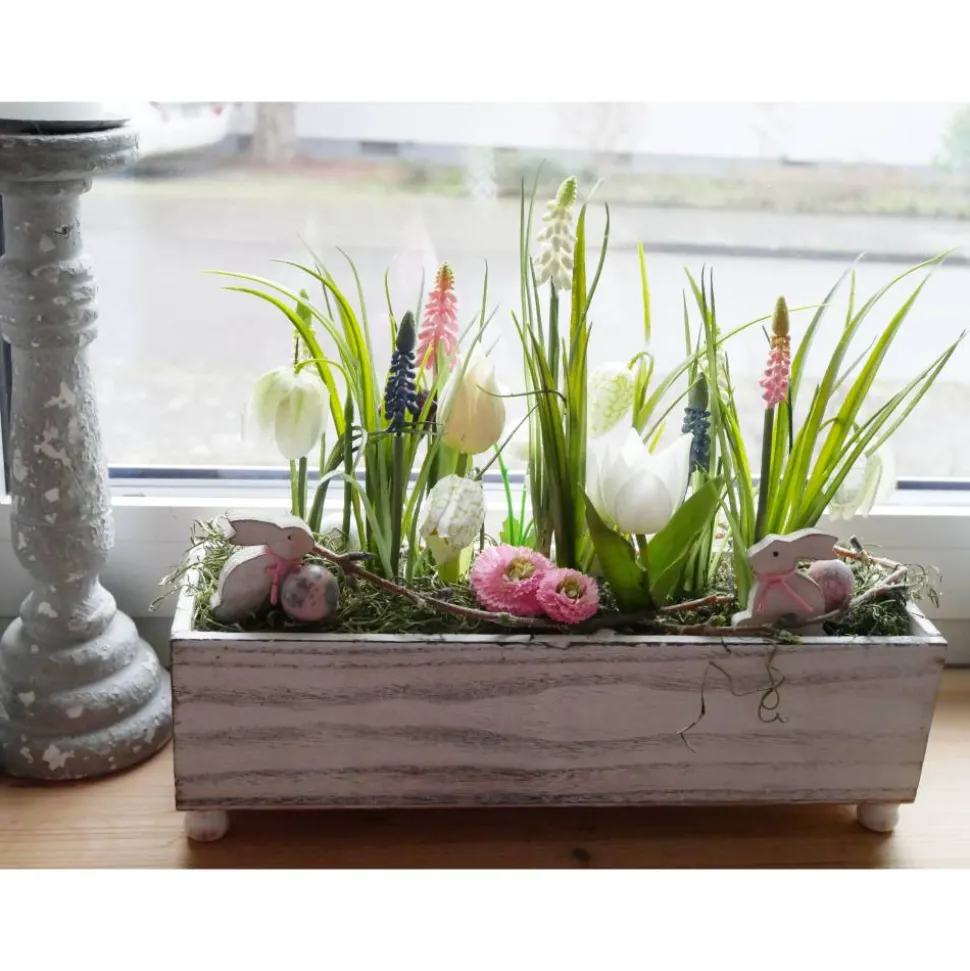 Holzkasten auf kleinen Holzfüßen im unregelmäßigen Vintage Look gefüllt mit einer Vielzahl an haltbaren Frühlingsblumen wie:7 Stck. Muscari, Bellis, Tulpen und Fritillaria auf Jungle-Moos.Kleine weiße Holzhasen sitzen zwischen den Blumen und erwarten den Frühling und die Osterzeit. Eine Box die sich prima für einen langen Tisch oder für die Fensterbank eignet und die man gerne im nächsten Jahr wieder aufstellt.