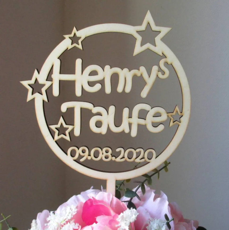 Blumen- / Tortenstecker Taufe Sternenkreis mit Name und Datum aus Holz, Caketopper, Tortentopper, Blumenstecker, Blumengesteck, Schriftzug