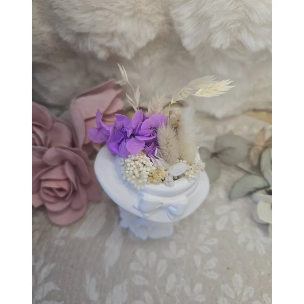 Das Blumenmädchen trägt einen kleinen Hut mit feiner Schleife und hält schützend ihr Stofftier – ein süßer Hase, der für Geborgenheit und Wärme steht. Im oberen Bereich ist sie mit echten Trockenblumen in zarten Lila- und Naturtönen verziert. Die Kombination aus mattem Weiß und den sanften Blütenfarben verleiht Laila eine besonders harmonische Ausstrahlung.