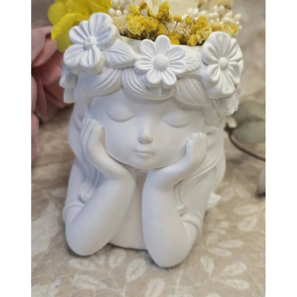 Blumenmädchen „Sunny“ bringt Wärme und Leichtigkeit in dein Zuhause. Mit geschlossenen Augen und sanft aufgestützten Händen strahlt sie Ruhe aus – während die leuchtend gelben Trockenblumen wie kleine Sonnenstrahlen aus ihrem Haar hervorblühen.