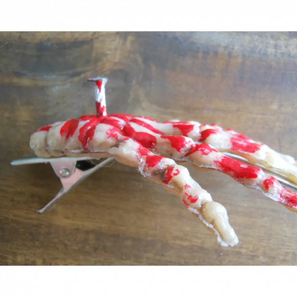 Setze auf einen schaurigen Hingucker! Die blutige Hand Haarspange mit Nagel vereint das perfekte Horror-Accessoire mit ausgefallenem Stil für Halloween, Gothic oder Rockabilly. Die Haarspange zeigt eine detaillierte, blutige Skeletthand, die durch einen Nagel noch bedrohlicher wirkt.