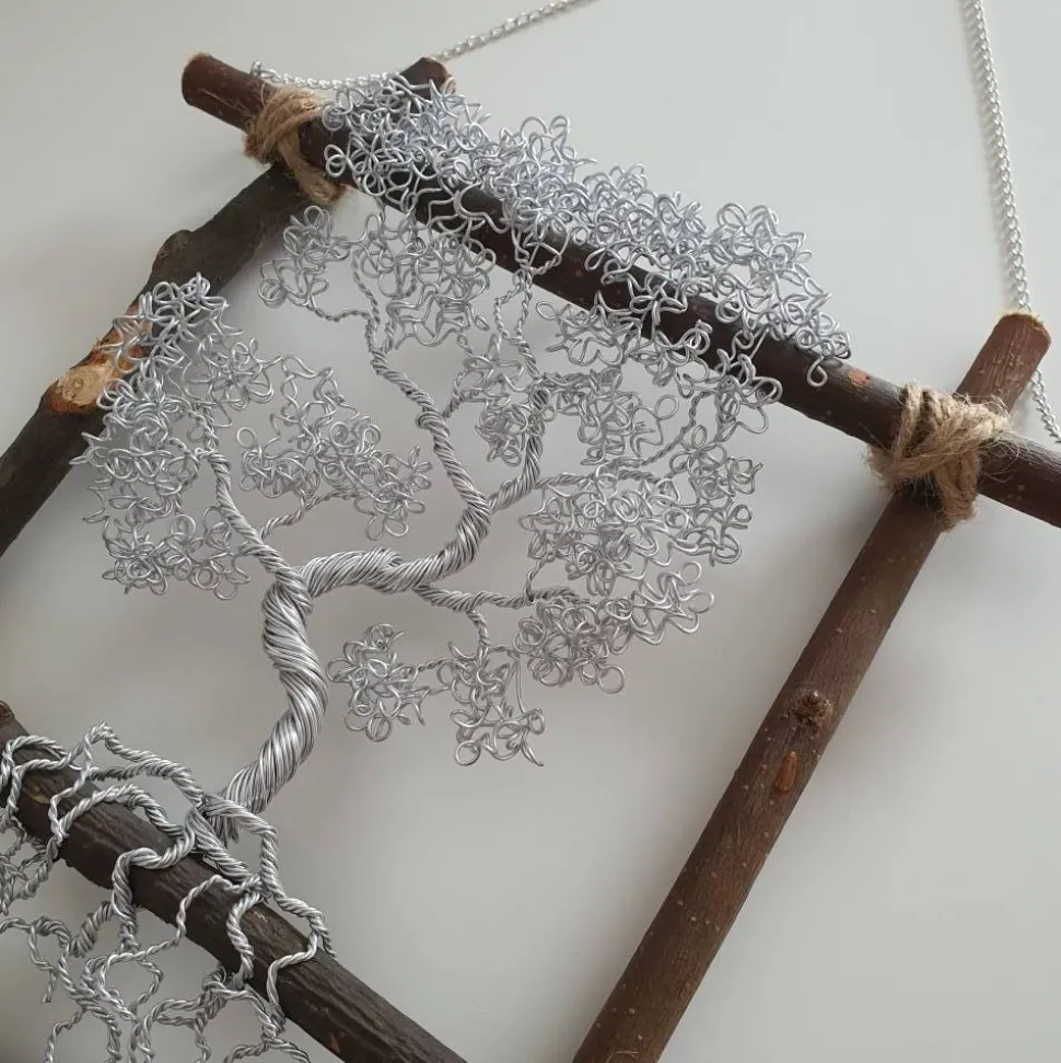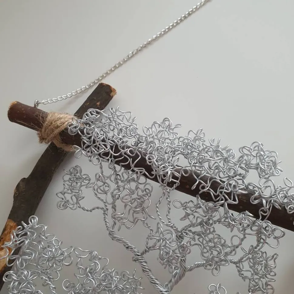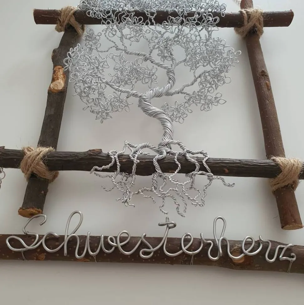 Der Drahtbaum selbst besteht aus Aluminiumdraht, ich verwende für den Baum über 25 Meter Draht. Der Rahmen besteht aus 4 Natur Ästen die durch eine Kordel verknotet werden. Als Aufhängung dient eine Eisenkette die silberfarben plattiert ist, die am oberen Ast befestigt ist. Diese Dient auch als Verbildung zum Ast mit dem Schriftzug. Der Schriftzug wird aus silberfarbenen Aluminiumdraht Handgebogen. Und wird mit sehr dünnen Draht auf dem Ast befestigt.