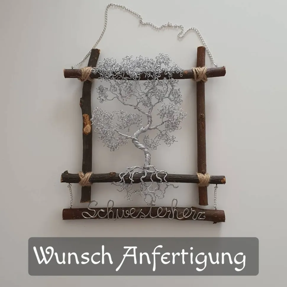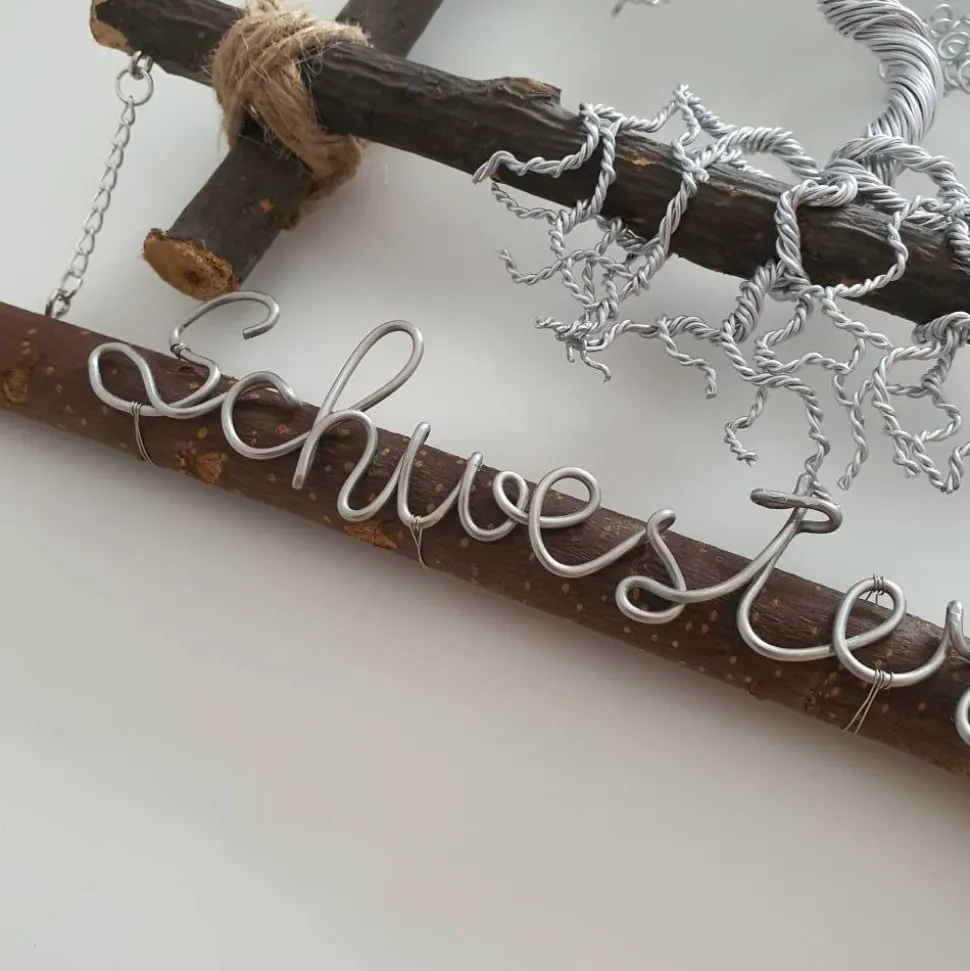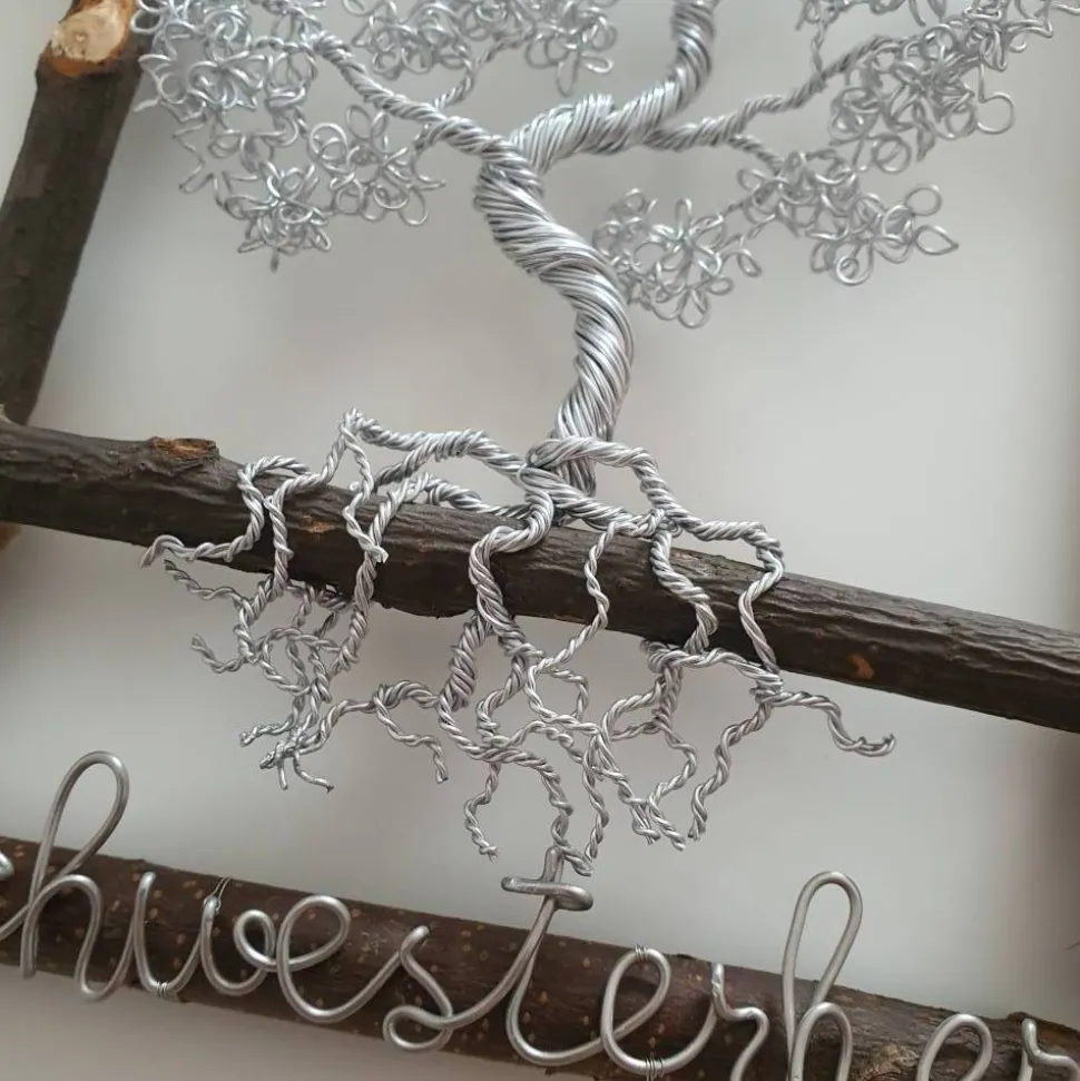 Der Schriftzug kann auch individuell angefertigt werden. Der Drahtbaum wurde nicht an die Äste geklebt, sondern wurde von mir mit dem Draht selbst an den Ästen befestigt.