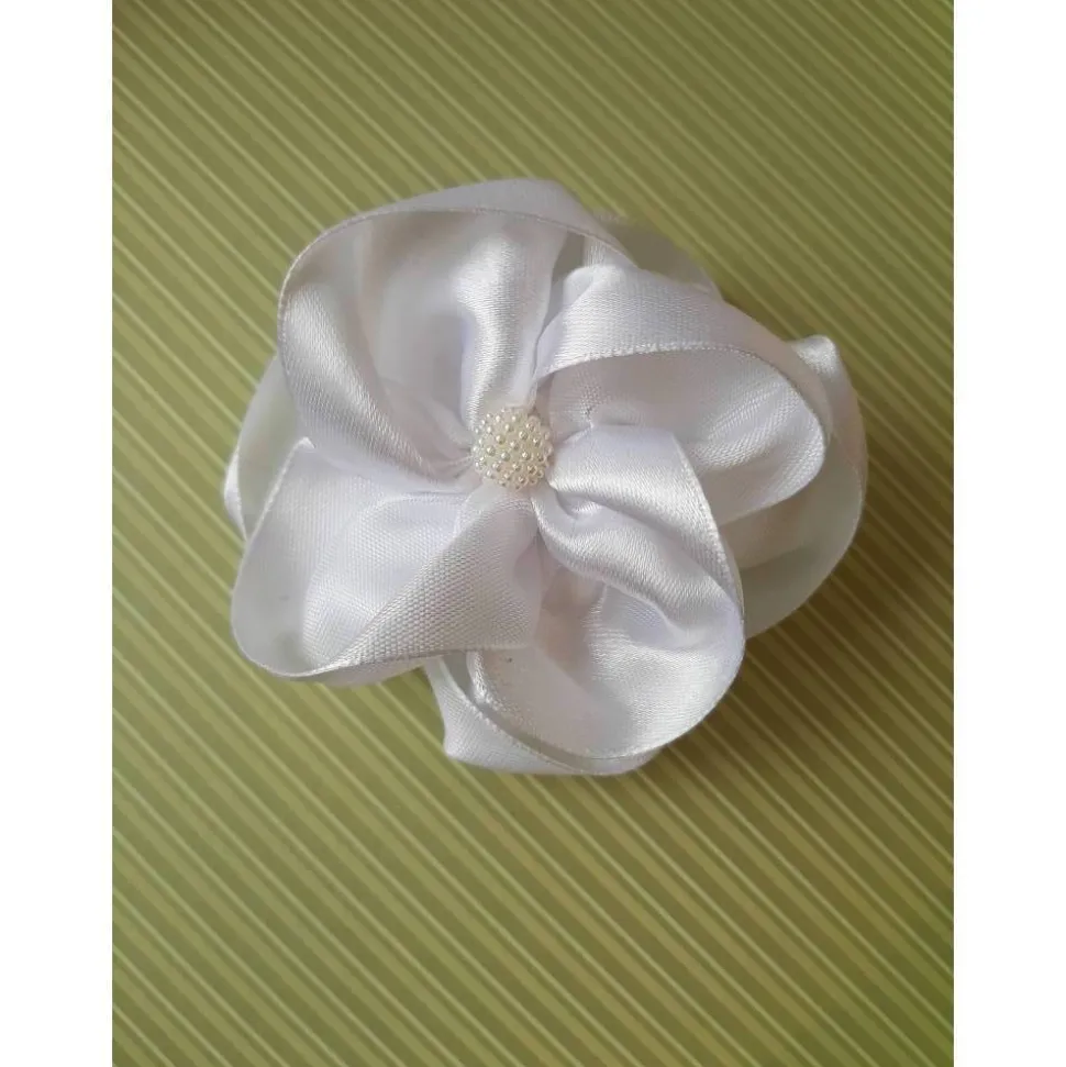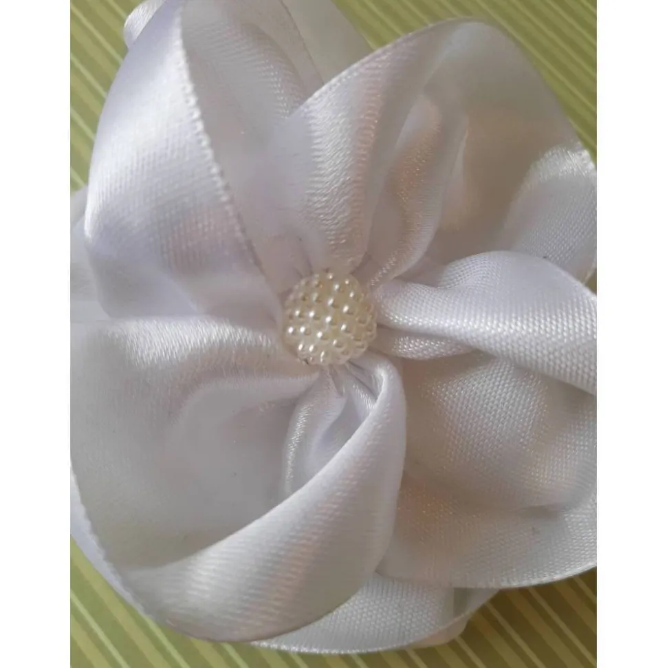 Romantische Haarklammer in Form einer Blüte, individuell gefertigt aus weißem Satin. In der Mitte eine hübsch Kunstperle.