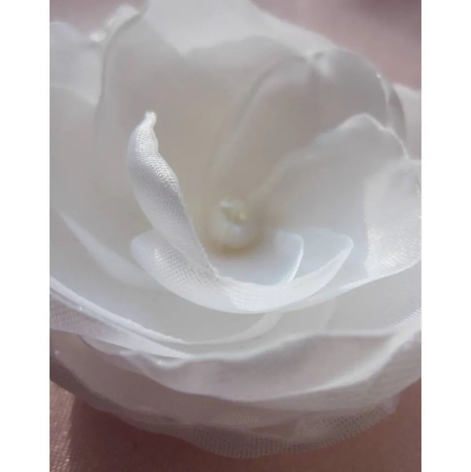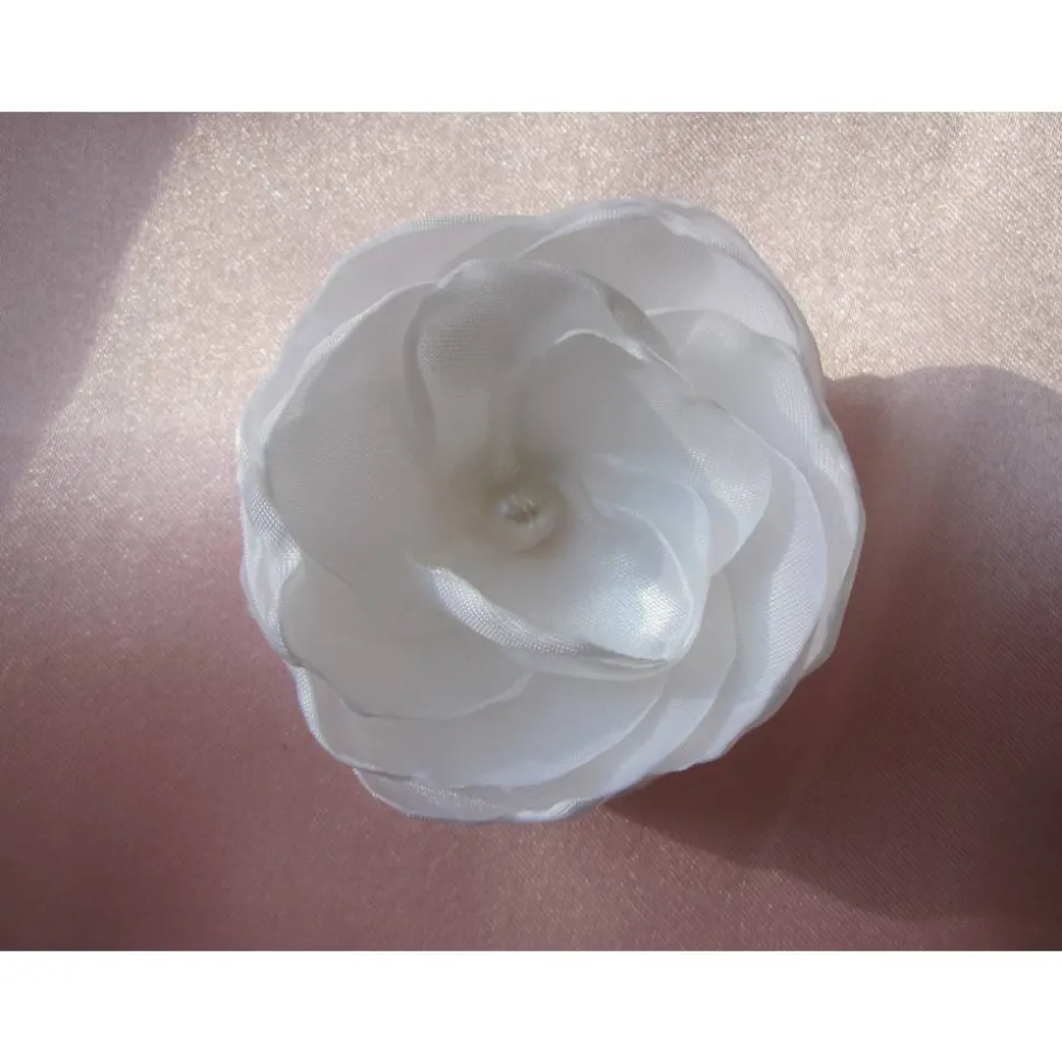 Romantische Haarklammer in Form einer Blüte, individuell gefertigt aus weißem Satin. In der Mitte eine echte Süßwasserperle.