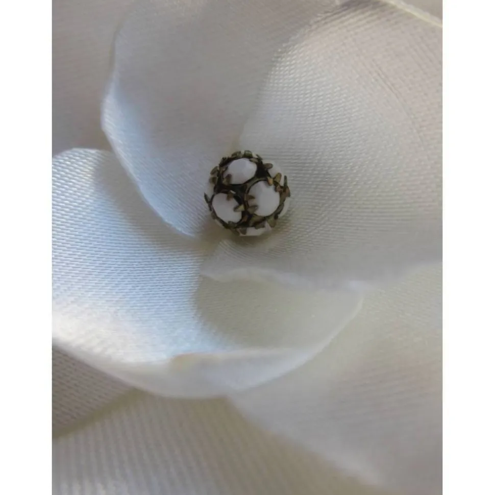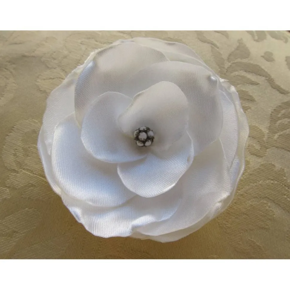 Zauberhafte Haarklammer in Form einer cremeweißen Blüte, individuell handgefertigt aus schimmerndem Satin. In der Mitte eine ausgefallene Perle, die aus mehreren Steinen zusammengesetzt ist.