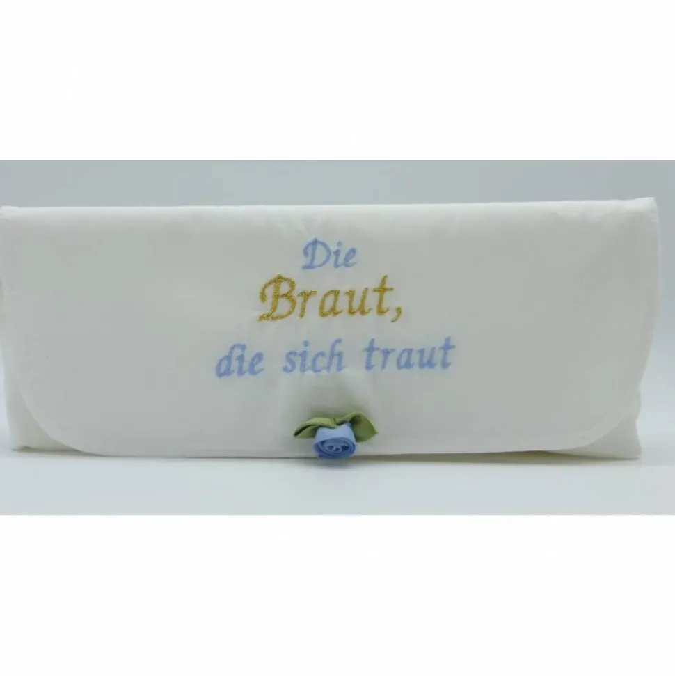 Vorne ist ein kleines, blaues Satinröschen aufgenäht.