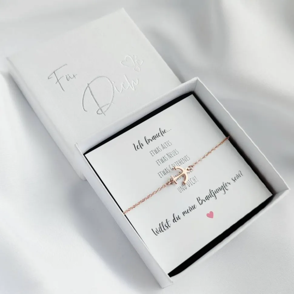 Das Brautjungfer Armband kommt in einer stilvollen Geschenkbox und mit einer liebevoll bedruckten Karte: „Willst du meine Brautjungfer sein?“. So schenkst du nicht nur ein besonderes Accessoire, sondern auch eine emotionale Erinnerung.