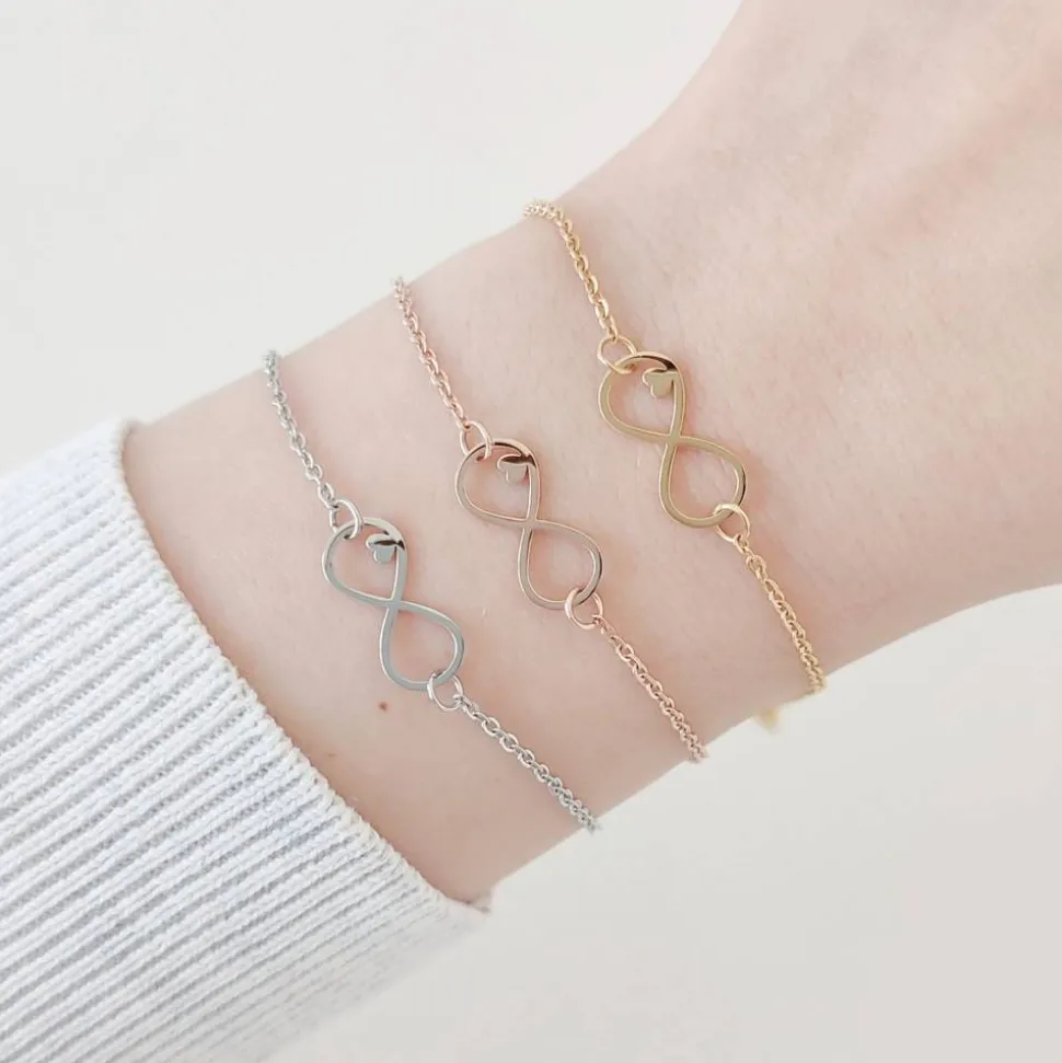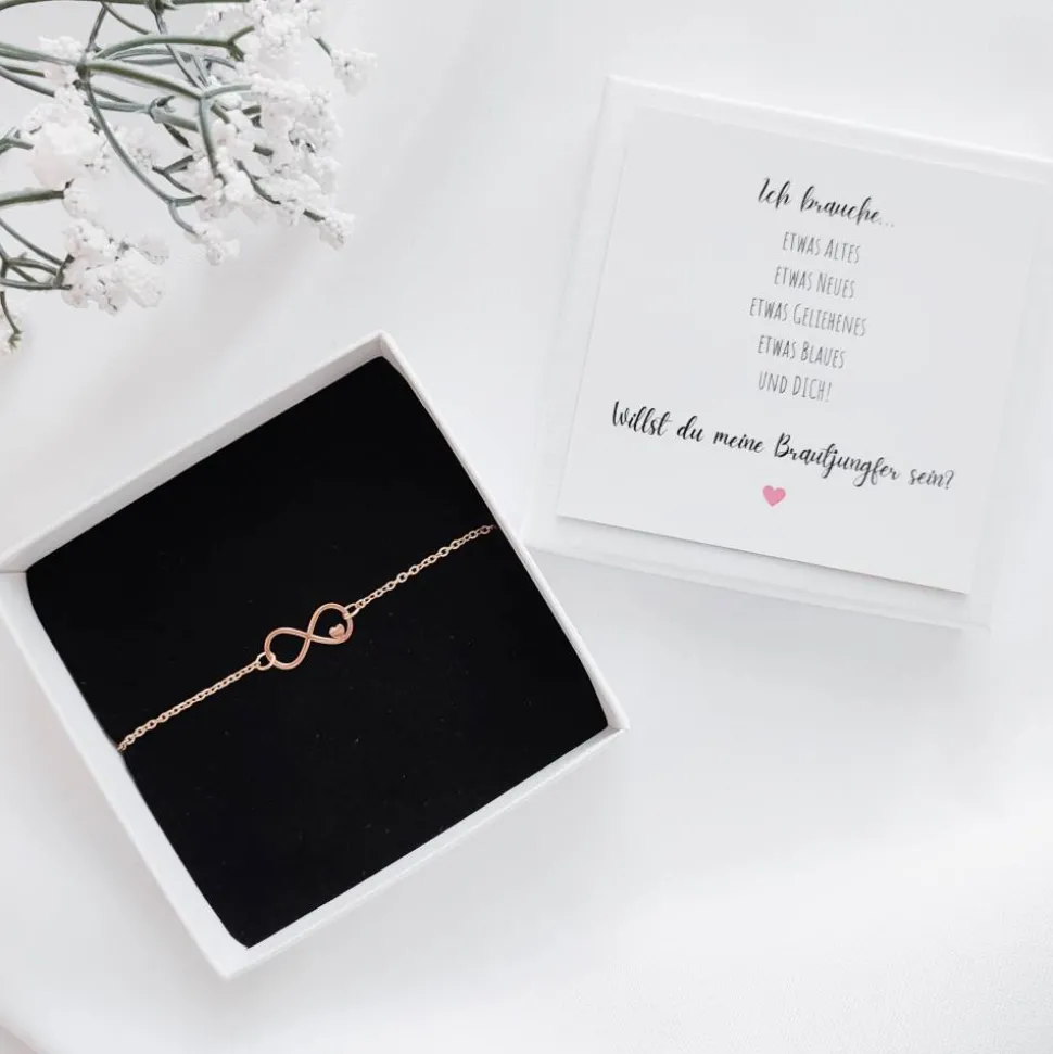 Dieses einzigartige Brautjungfer Armband wird deiner Freundin ein strahlendes Lächeln auf die Lippen zaubern. Die Kombination aus hochwertigen Edelstahl Elementen und dem auf Hochglanz polierten Infinity mit Herz Symbol machen das Armband zu der perfekten „Brautjungfer fragen“ Idee. Die Farbe des Brautjungfer Armbandes kannst du ganz einfach auswählen.