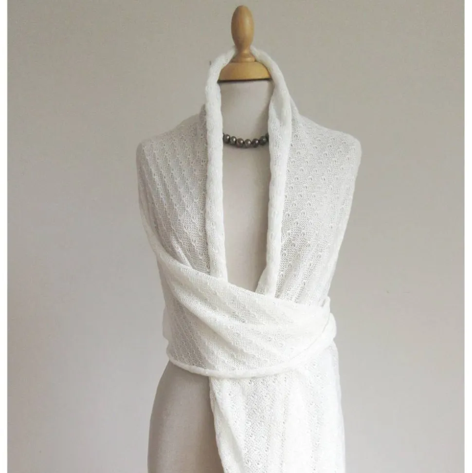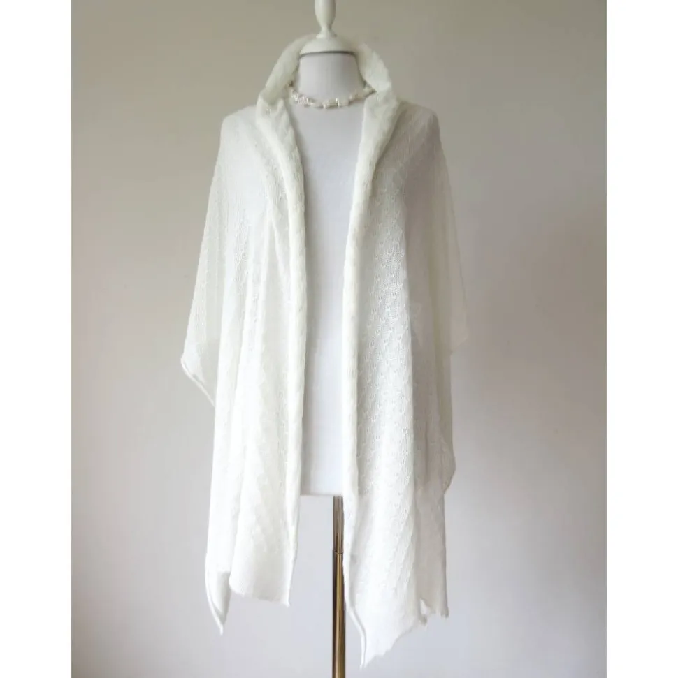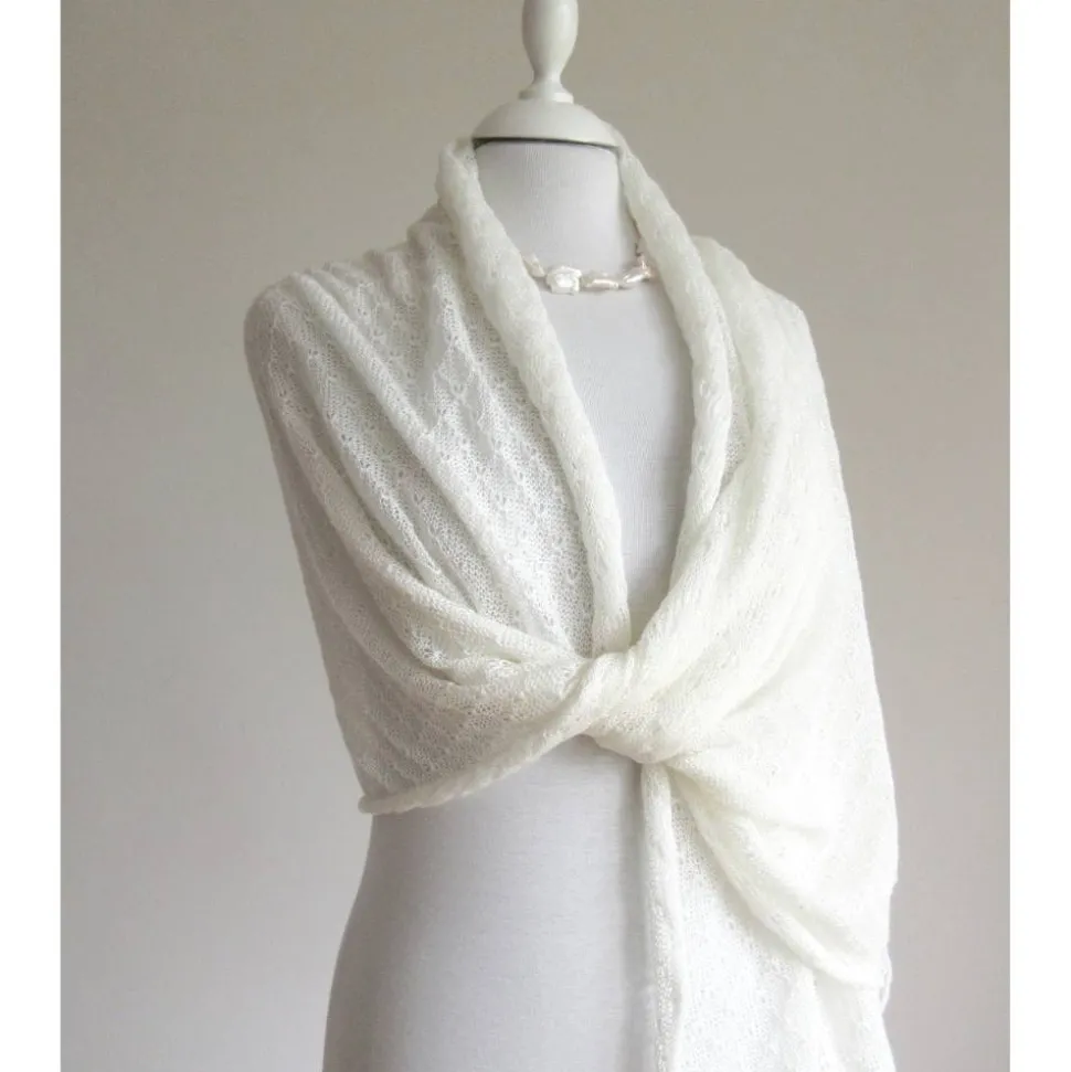 Edle Lace-Stola, gestrickt aus dünnem italienischen Kaschmirgarn in Ivory/Elfenbeinweiß. Die Farbe ist ein helles Ivory, fast weiß.