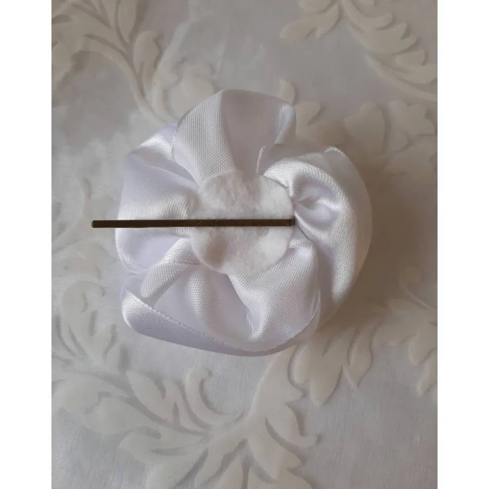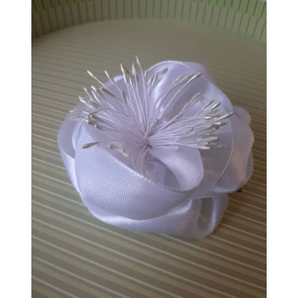 Wunderhübsche Haarklammer in Form einer Blüte, individuell gefertigt aus reinweißem Satin. In der Mitte künstliche Blütenstempel in zartem Hellgelb. Der Durchmesser der Stoffblume beträgt ca. 8 cm.