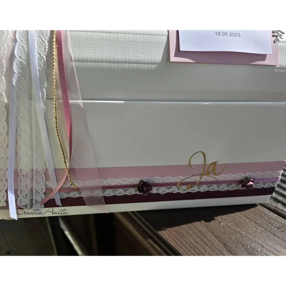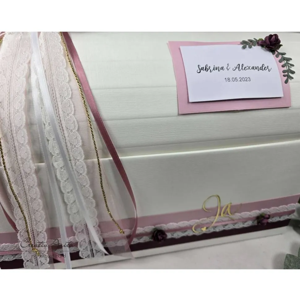 *TRUHE* mit altrosa- und brombeerfarbener Banderole bestückt mit Spitzenband und Papierrosen in Brombeere. Auf dem Spitzenband wurde noch das Wort „Ja“ angebracht.