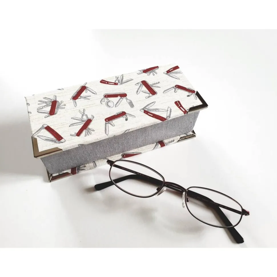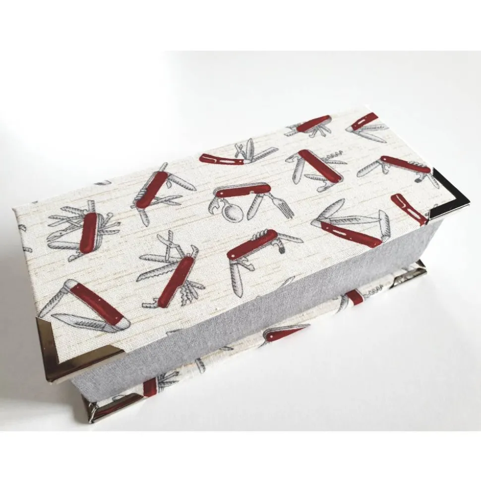 Baumwollstoff weiß mit Taschenmesserrmotiven, Baumwollstoff hellgrau, Karton und Ecken silber