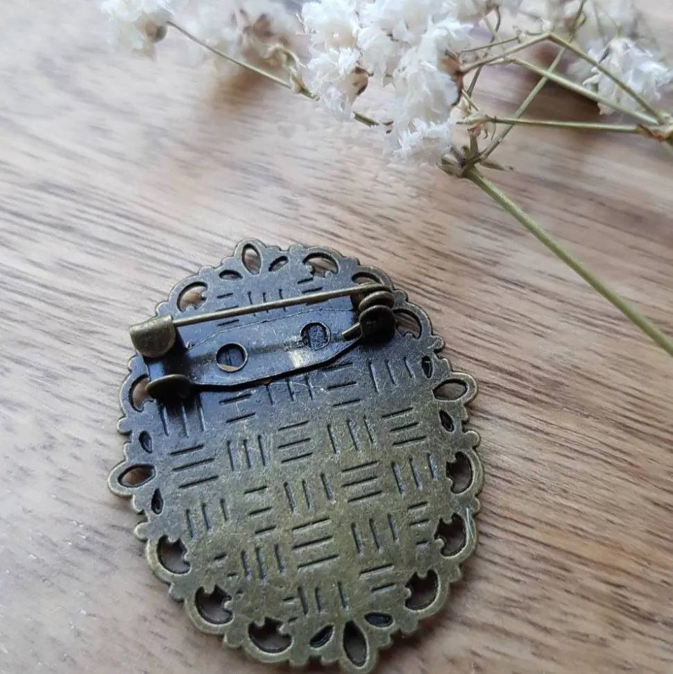 Brosche in bronzefarbe Glaseinsatz ist 18x25mm im groß. Fassung ist etwas größer.