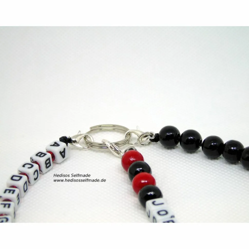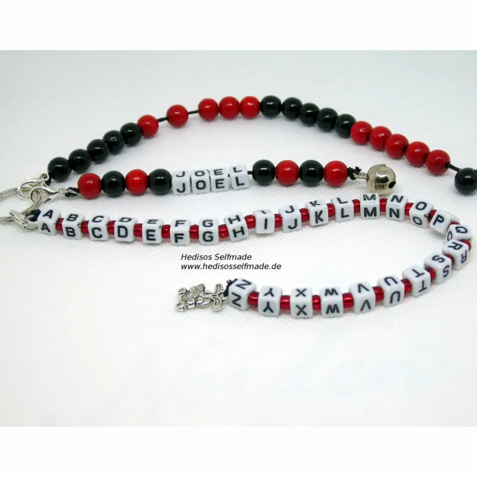 Diese Buchstabenkette macht das Lernen vom ersten Tag an schöner und leichter. Die Buchstabenkette mit dem kompletten Alphabet hilft beim Lernen der Buchstaben. Hier kann das Kind auch jedem zeigen, welche Buchstaben es nun schon kennt. Eine weitere Kette kann man zum Rechnen bis 20 hinzuziehen. Holzperlen in zwei Farben sind hier in Fünfergruppen angeordnet, die beim Rechnen lernen eine gute Hilfe sein können. Den Abschluss bildet noch eine Kette mit dem Namen des Kindes. Alle drei Ketten sind durch Karabinerhaken an einem Schlüsselring befestigt, was es auch möglich macht, jede Kette beliebig von dem Schlüsselring zu entfernen und separat zu verwenden.