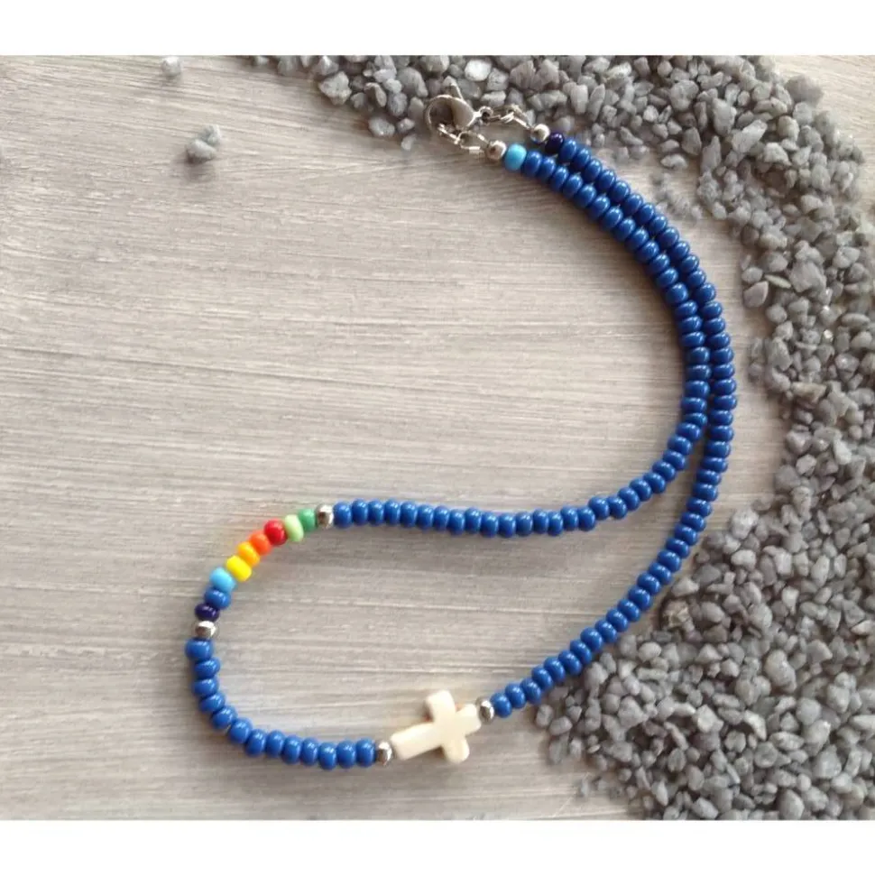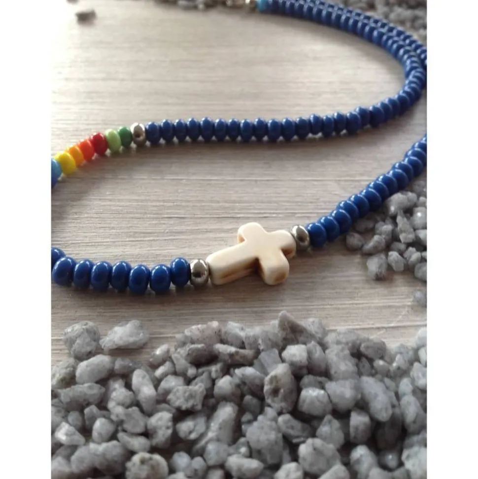 Jeansblaue und bunte Rocailles ( Durchmesser ca 4mm ), ein weißes Howlithkreuz ( ca 16 mm x 8 mm) und Edelstahlperlen sind auf nylonummantelten Schmuckdraht aufgereiht. Die Bandenden sind mit Drahtschutzbügeln versehen. Geschlossen wird die 39,5 cm lange Kette mit einem Edelstahlkarabiner.
