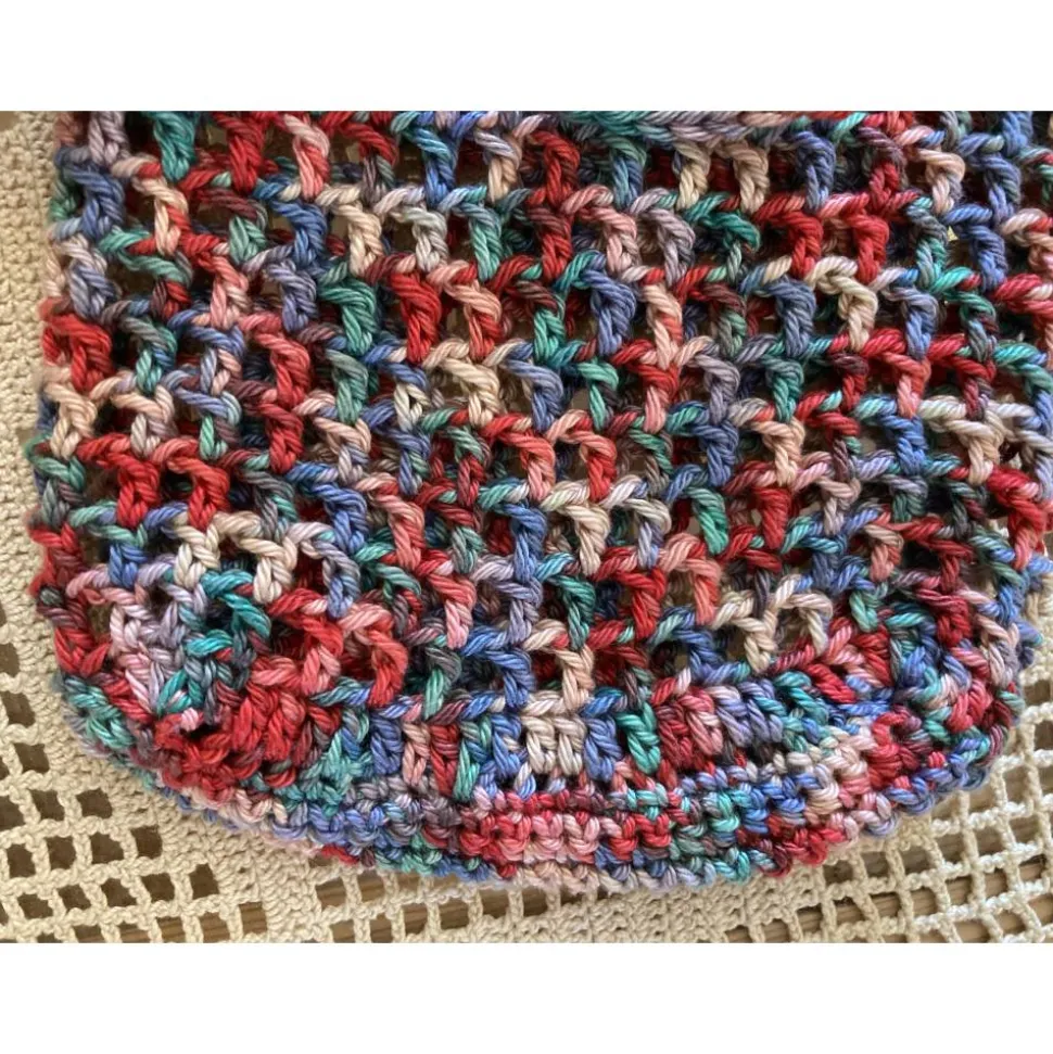 Das Häkelnetz ist mit einem festen Boden aus festen Maschen und halben Stäbchen gehäkelt. Der obere Rand besteht aus festen Maschen, während die Füllfläche mit einem Stäbchen-Lochmuster gehäkelt ist. Am oberen Rand befindet sich ein Häkelband als Verschluss aus dem gleichen, bunten Baumwollgarn.