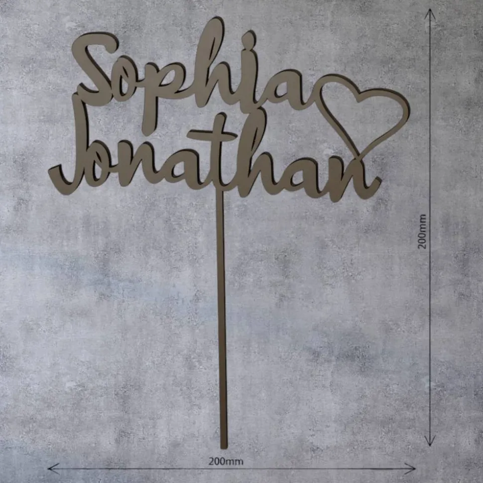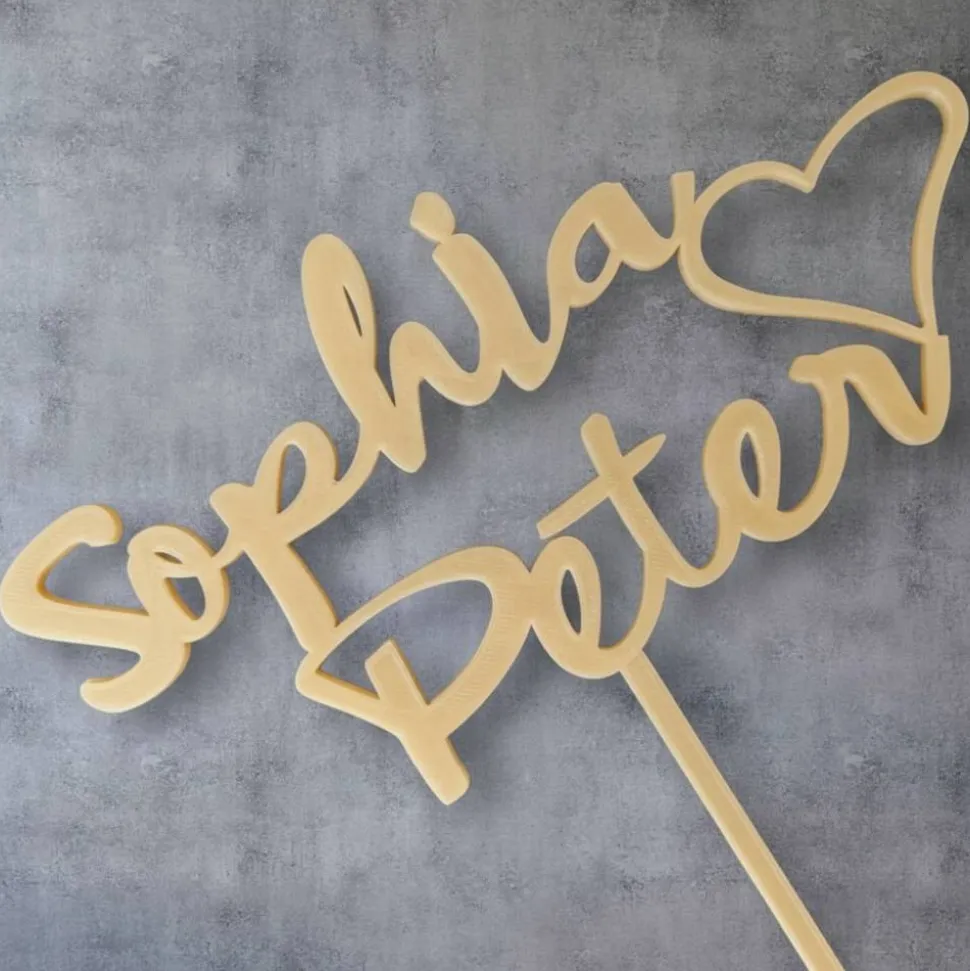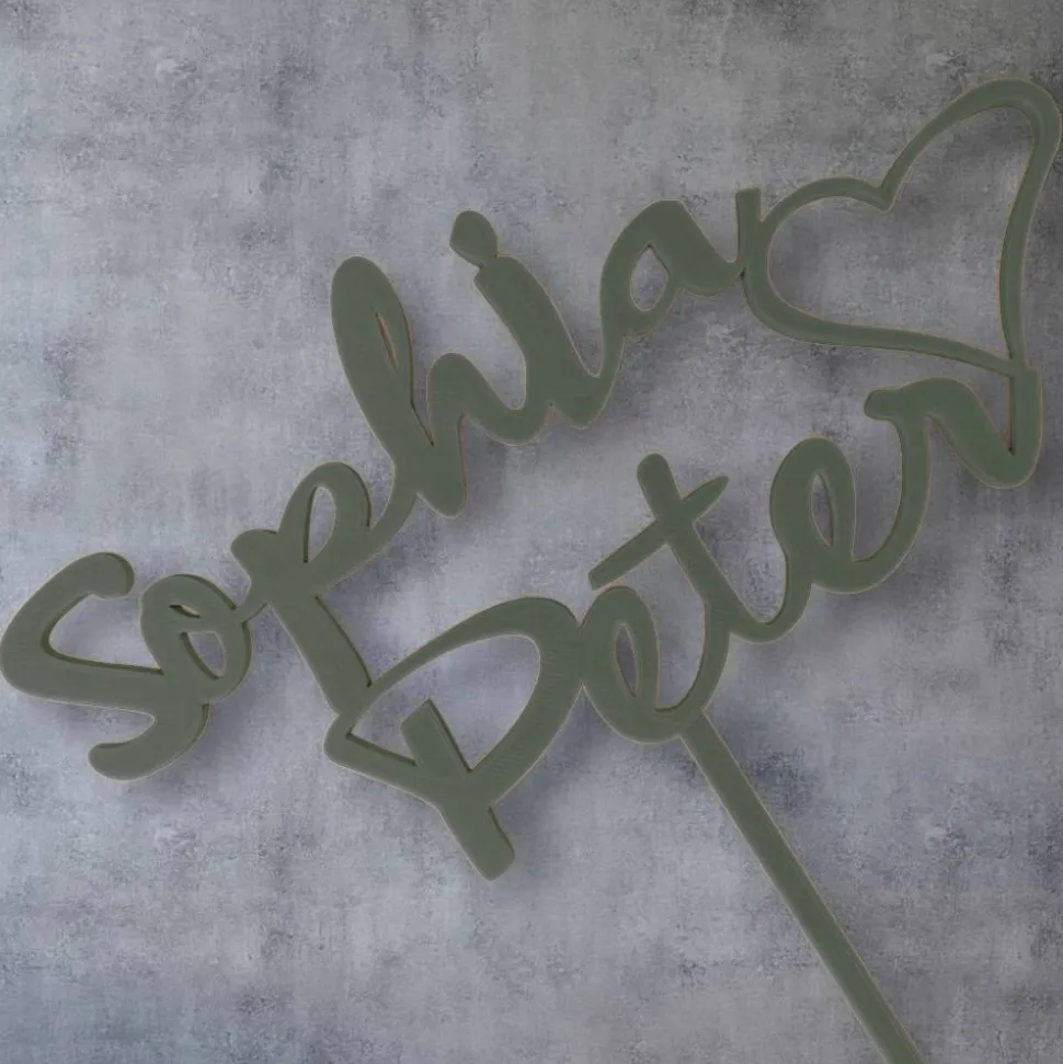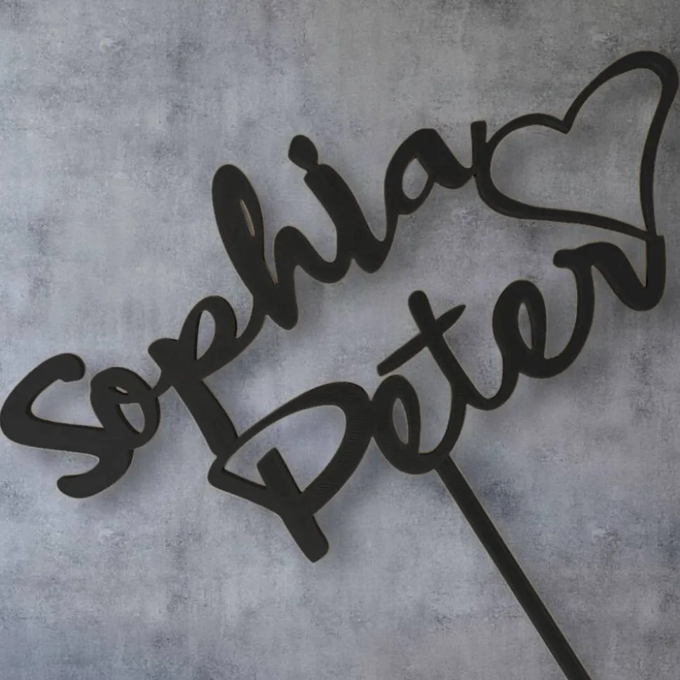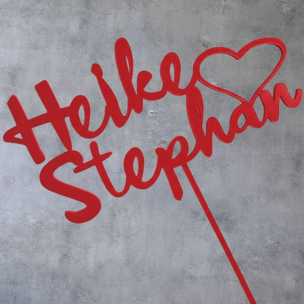 Der Cake Topper besteht aus zwei frei wählbaren Vornamen,die durch ein stilvolles Herz verbunden sind – ideal für romantische Hochzeits-und Verlobungstorten. Geben Sie bei der Bestellung die Namen an und wählen SieIhre Wunschfarbe.