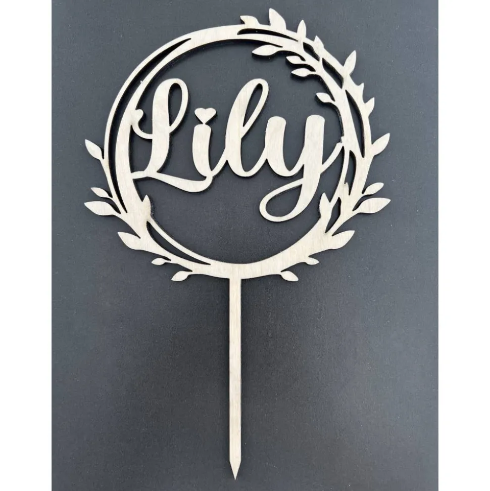 Der Caketopper auf dem Bild ist in der Farbe Eiche rustikal und hat einen Durchmesser von ca 15 cm.