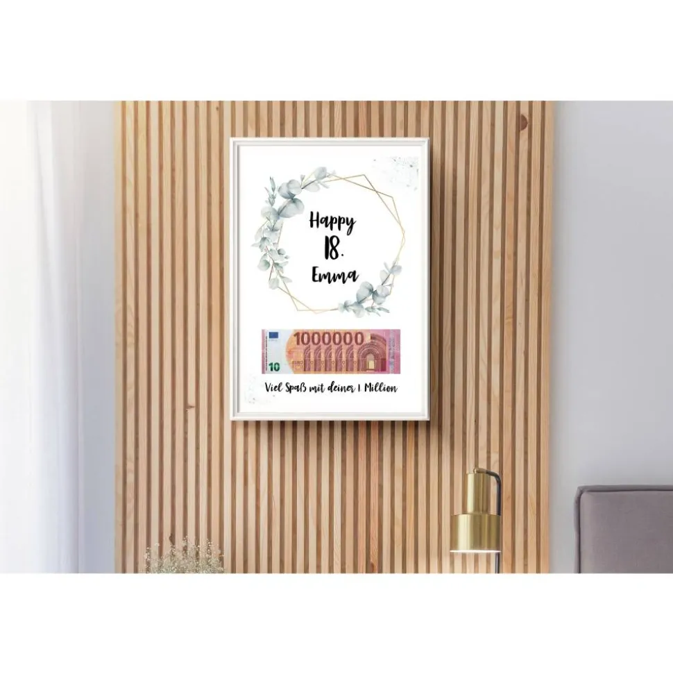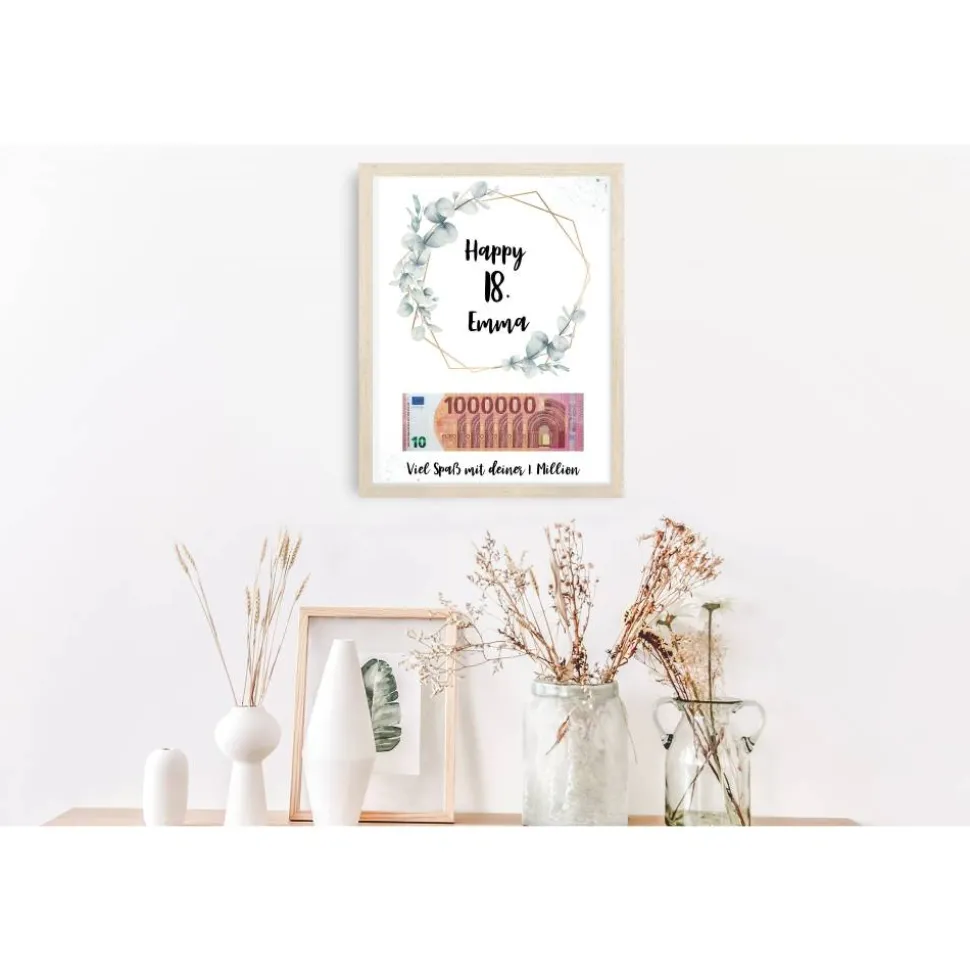 Du suchst nach einem hübschen persönlichem Geldgeschenk zum 18. Geburtstag deiner Freundin, deiner Tochter oder einer Kollegin? Mit diesem Download ist das Geschenk innerhalb weniger Minuten fertig. Nachdem du das Poster ausgedruckt hast, schneidest du am besten mit einem Cutter die Zahlen aus und hinterlegst dort die Geldscheine.