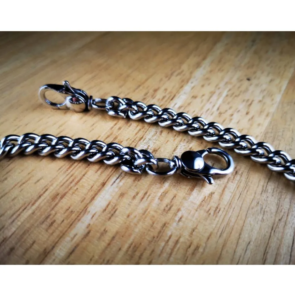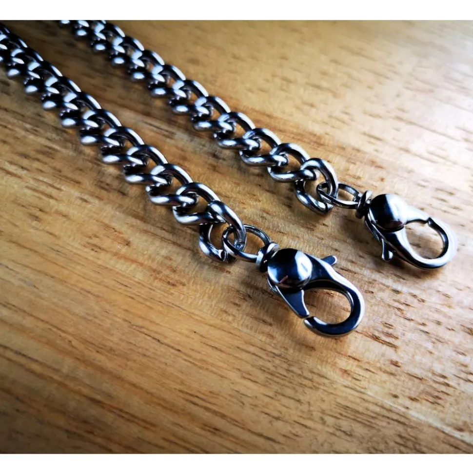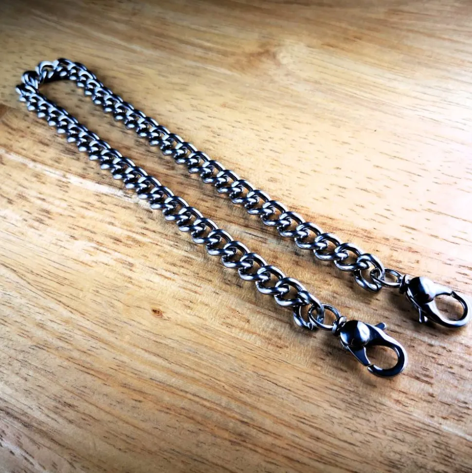 Es werden 2 Edelstahlringe mit einem Innendurchmesser von ca. 22 mm zu jeder Charivarikette dazugelegt, falls Sie das Charivari in Knöpfe einhängen möchten. Hier dann bitte beachten, dass sich die Länge um ca. 5 cm verlängert.