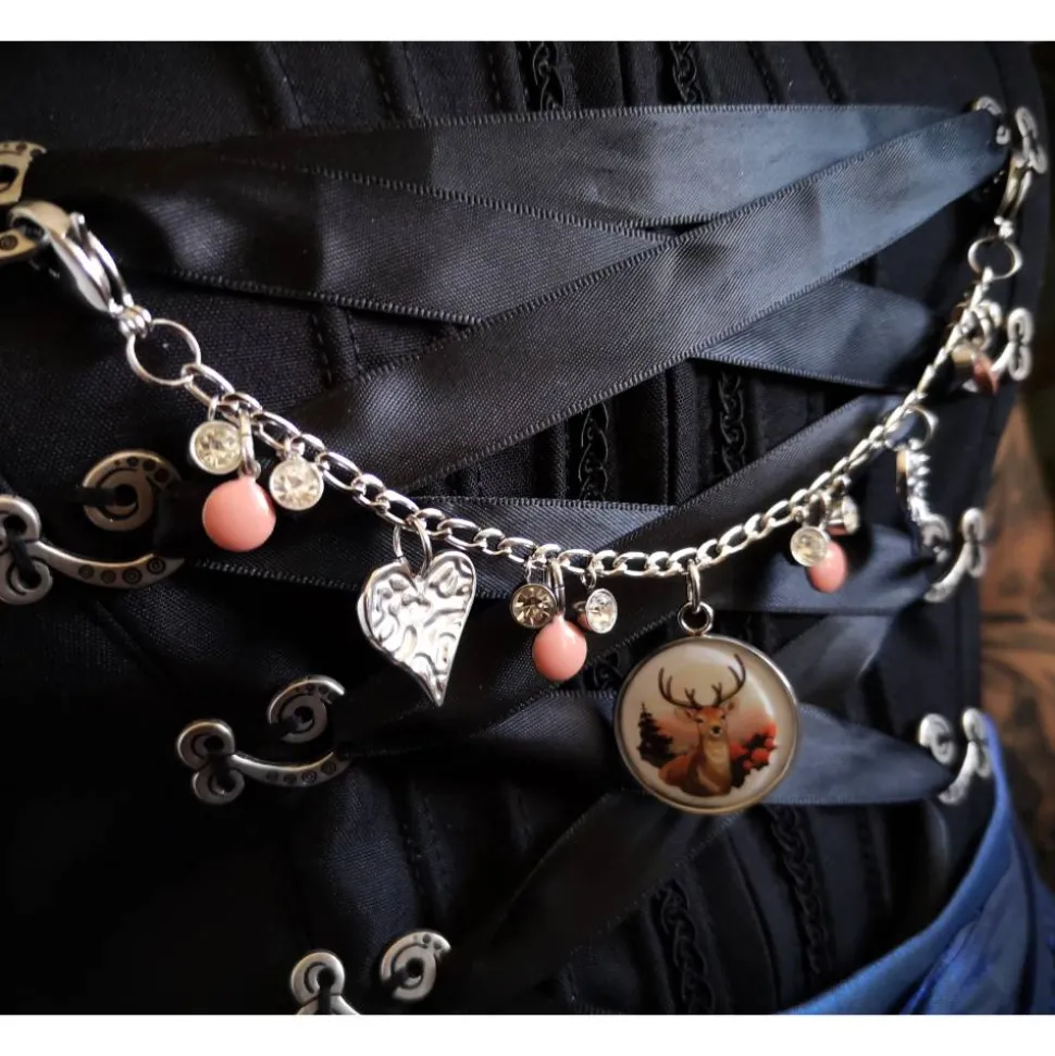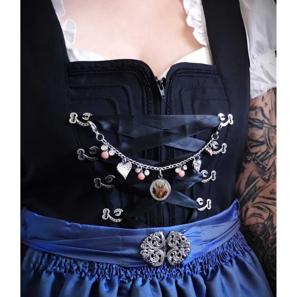 Mit Strass-, Emaille- und Herzanhänger verziert, strahlt dieses Charivari eine elegante und traditionelle Atmosphäre aus. Der farblich passende Hirschanhänger in der Mitte sorgt für einen besonderen Blickfang.