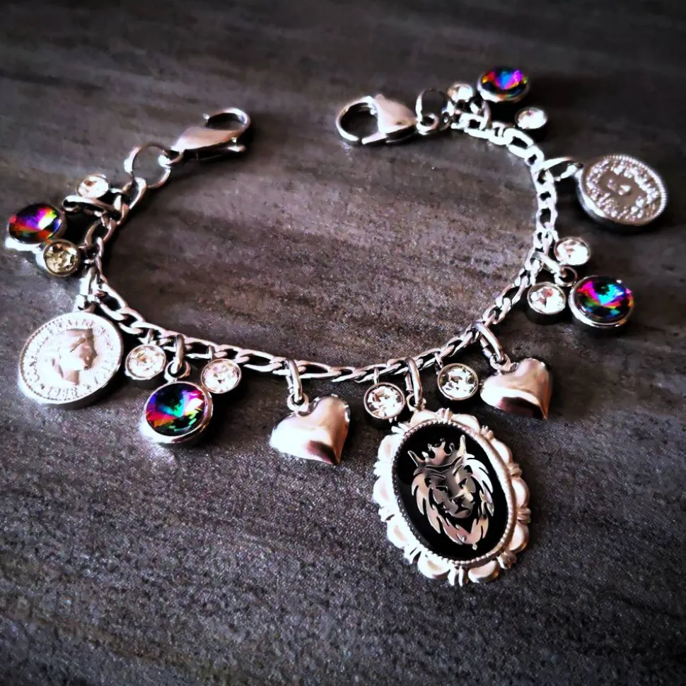 An einer massiven Edelstahlkette wurden glitzernde Strass-, Herz-, Münz- und Löwenanhänger angebracht.
