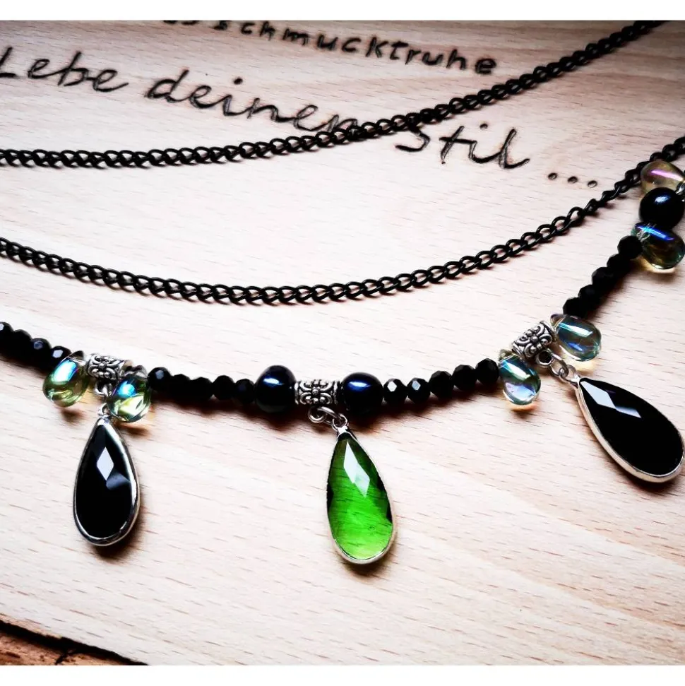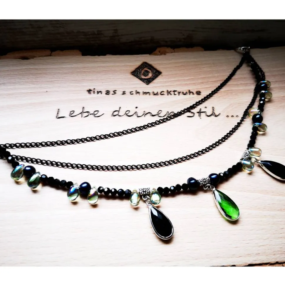 Dieses Charivari wurde aus irisierenden Glastropfen, Metallkette, schwarzen geschliffenen Glasperlen und einfefaßten Glasanhängern gefertigt.