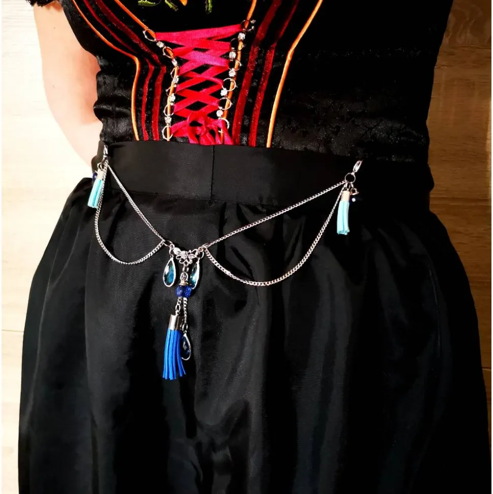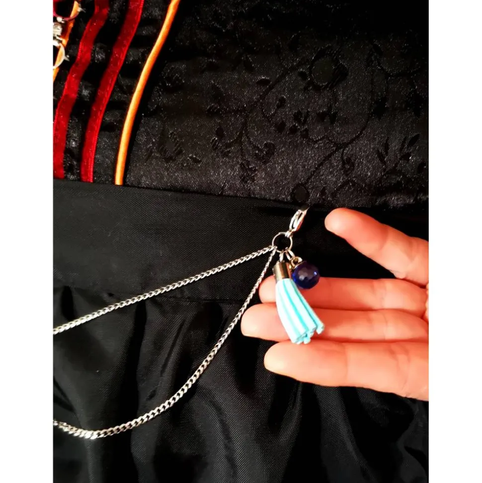 Unsere Charivaris sind meist für Schürzen (siehe Länge) gedacht. Dank großer, stabiler Edelstahlkarabiner läßt sich das Charivari problemlos einhängen und kann jederzeit gewechselt werden.